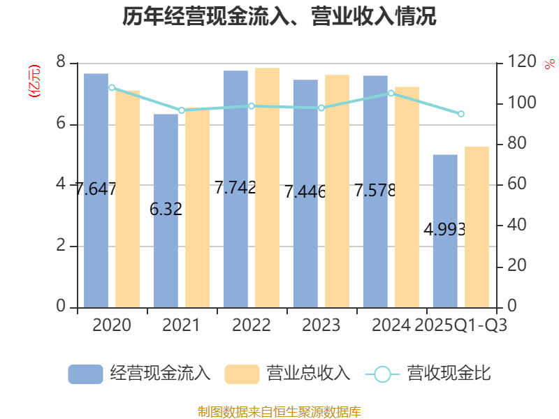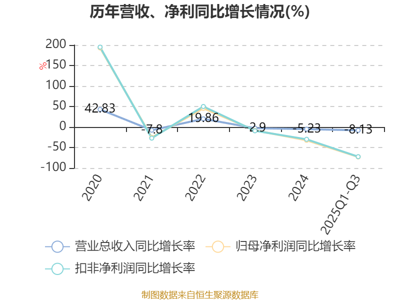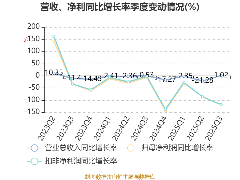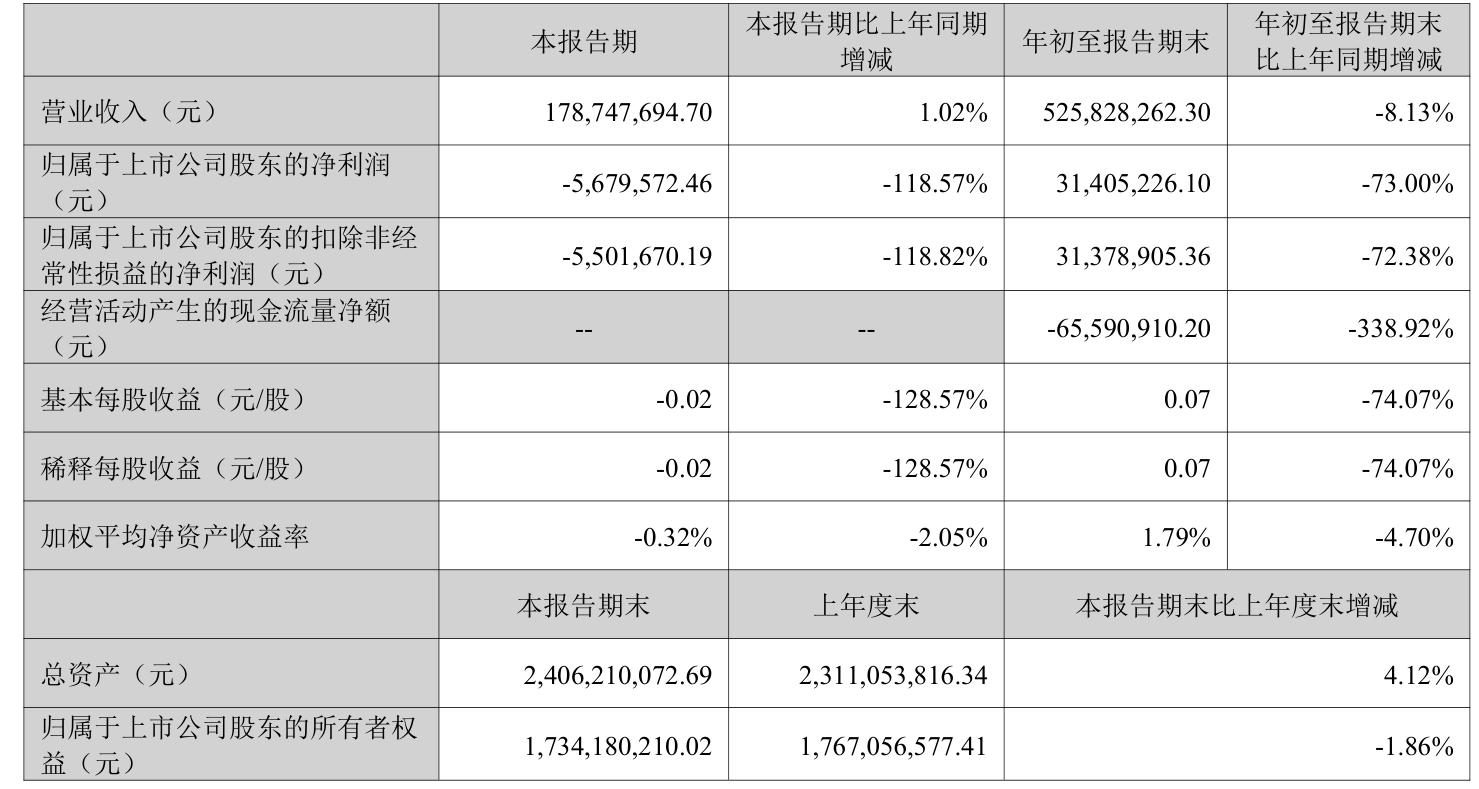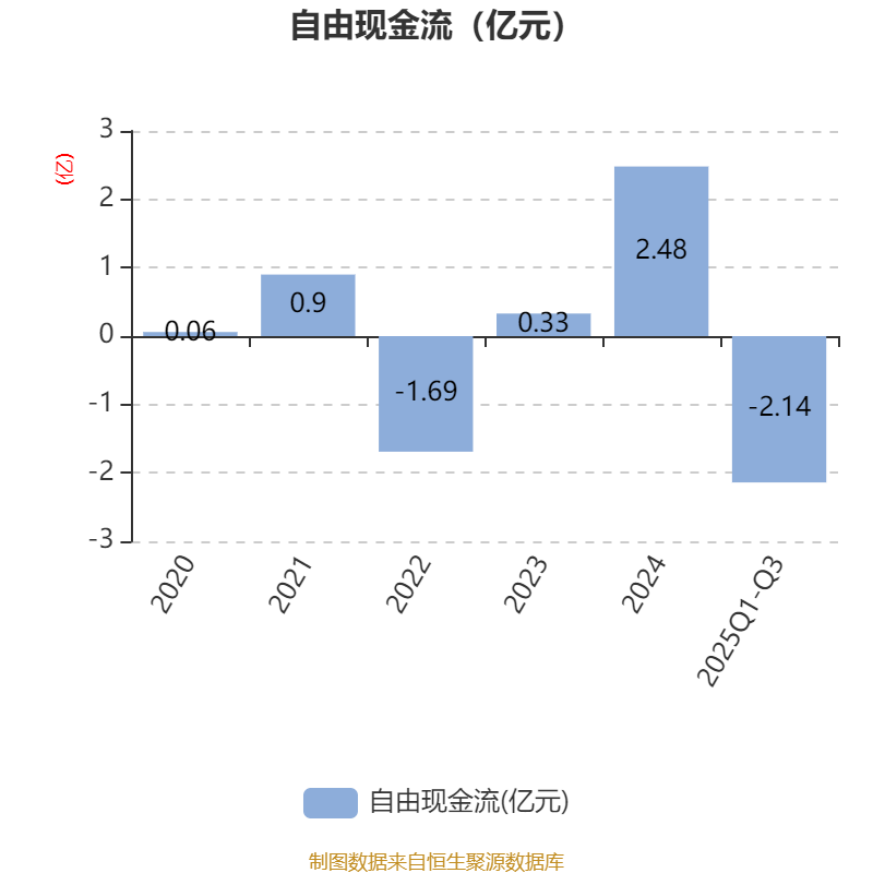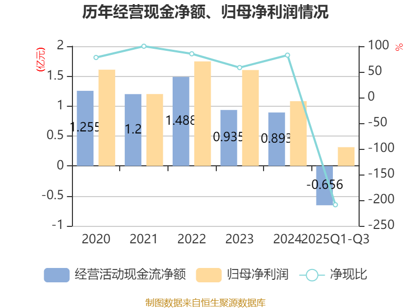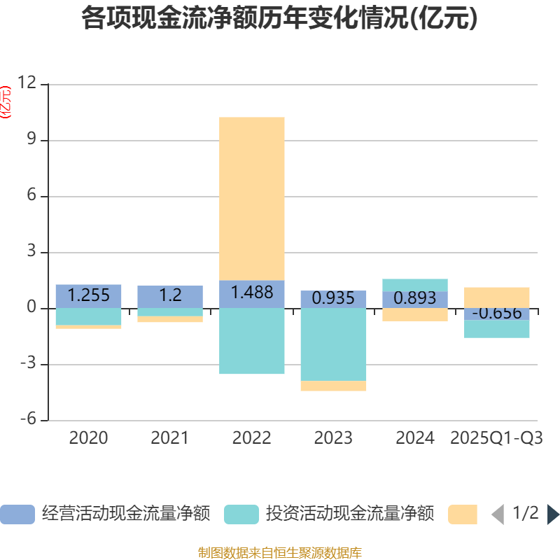 2025年前三季度,公司经营活动现金流净额为-6559.09万元,同比减少5064.73万元;筹资活动现金流净额1.1亿元,同比增加1.63亿元;投资活动现金流净额-9467.19万元,上年同期为8229.65万元。