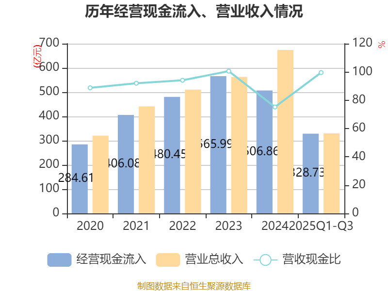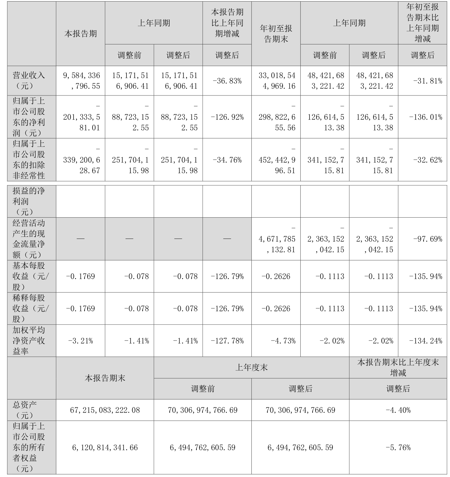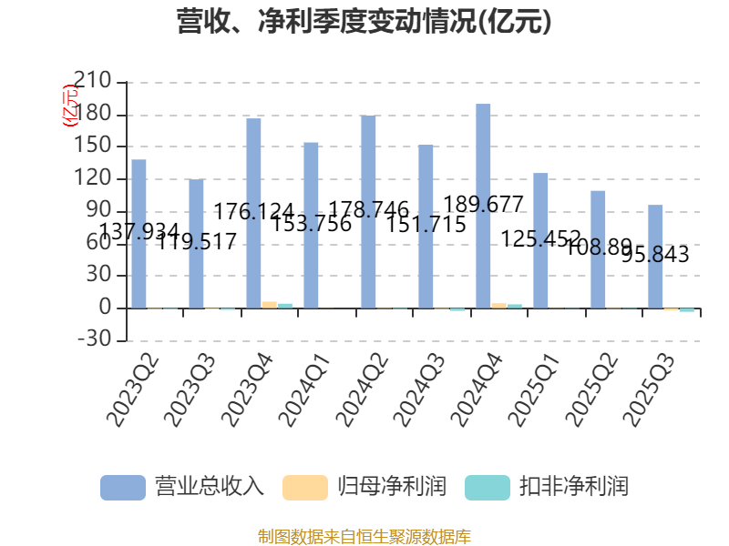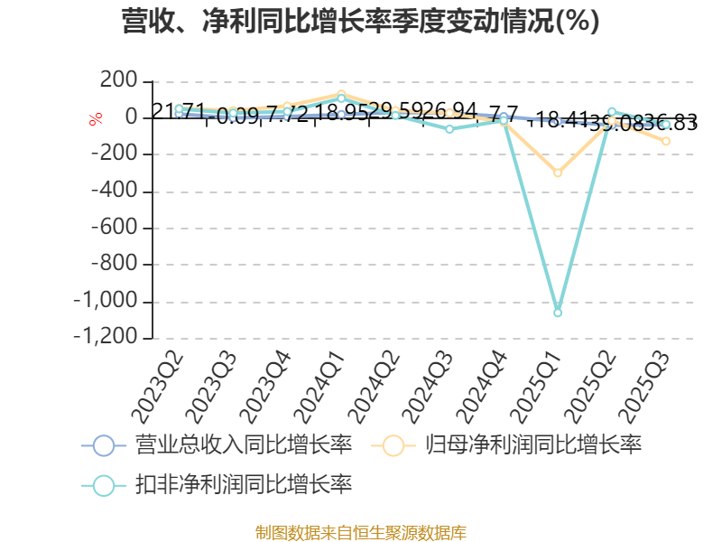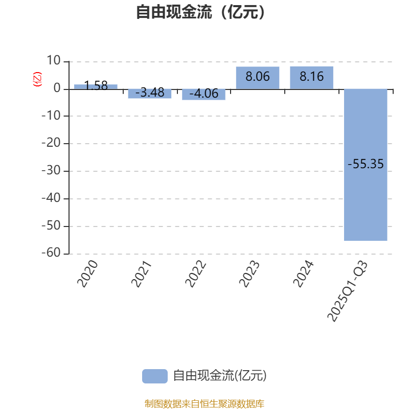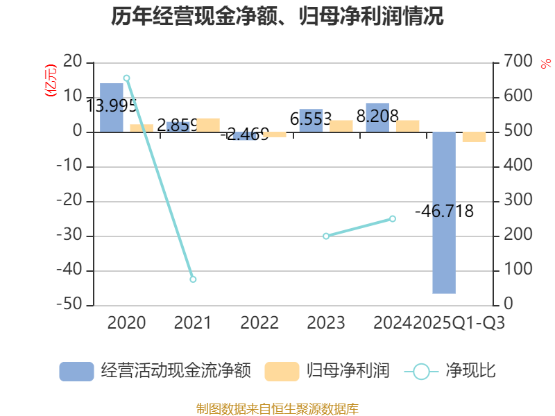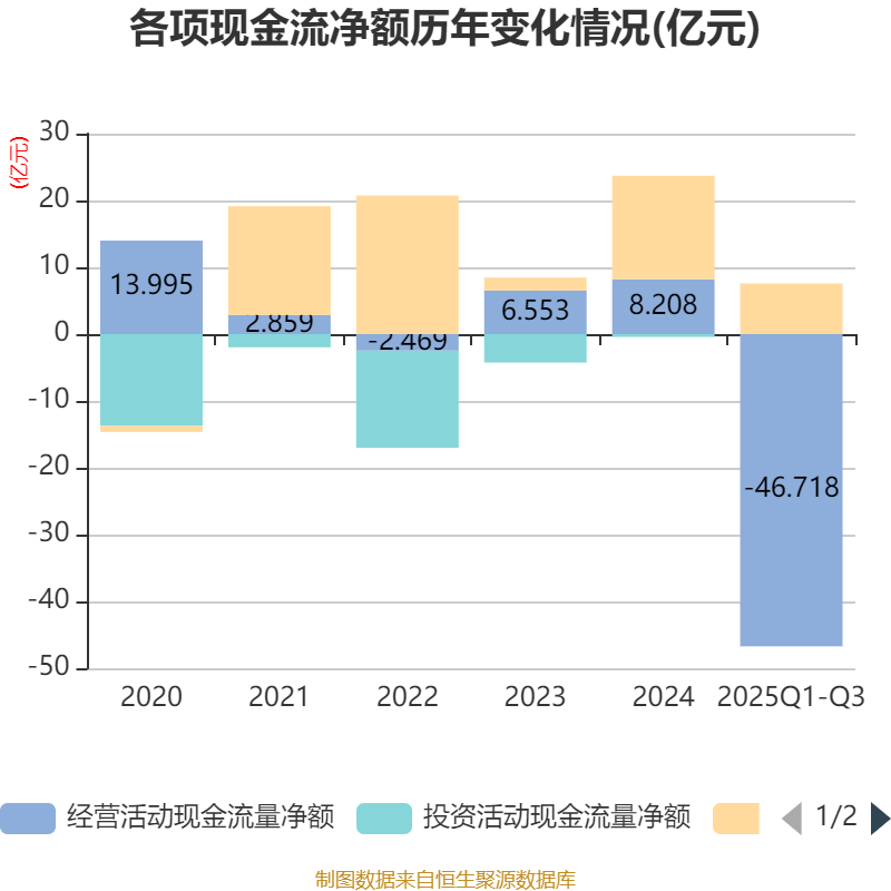 2025年前三季度,公司经营活动现金流净额为-46.72亿元,同比减少23.09亿元;筹资活动现金流净额7.58亿元,同比减少9.98亿元;投资活动现金流净额20.4万元,上年同期为1.78亿元。