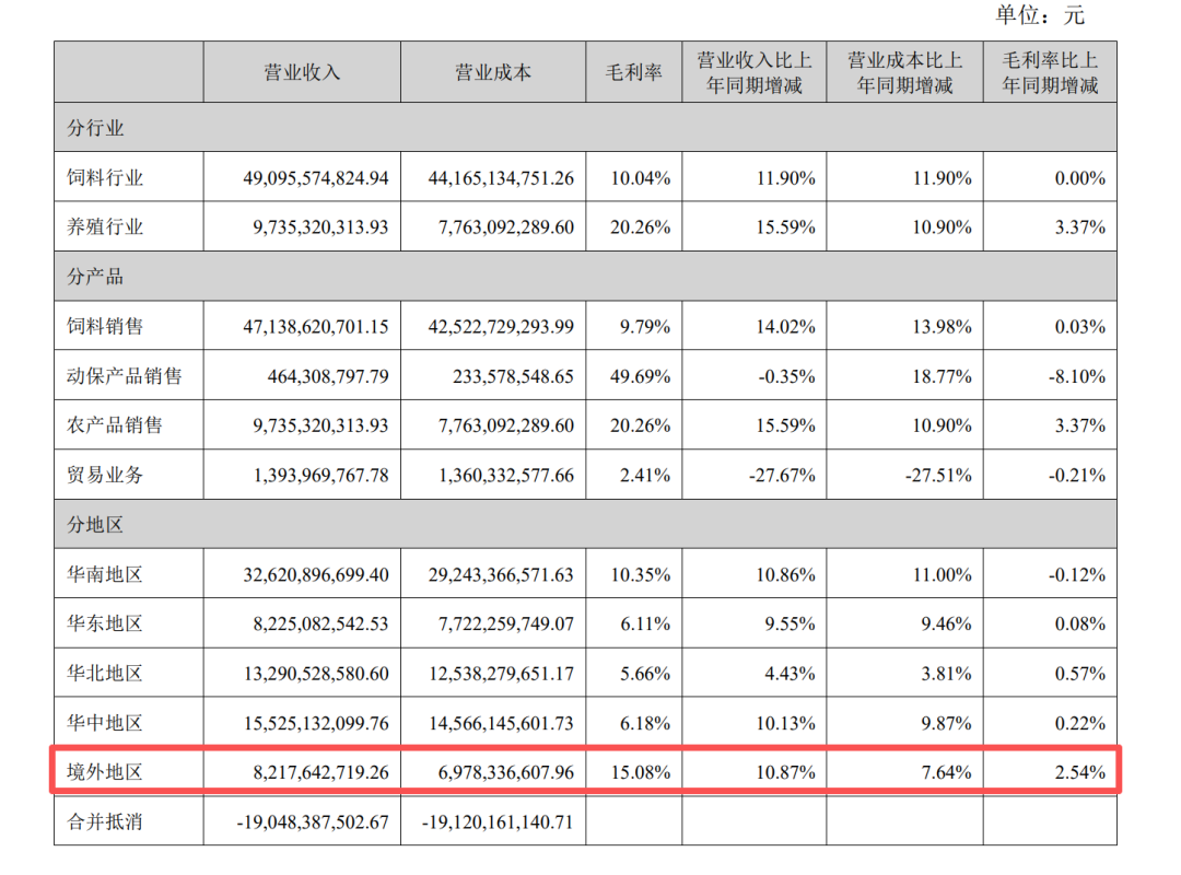 海外市场已成为海大集团重要的增长引擎。2025年半年报显示,上半年海大集团境外地区营收达82.18亿元,同比增长10.87%,占营收比重为13.97%。境外地区的毛利率为15.08%,远超境内水平。