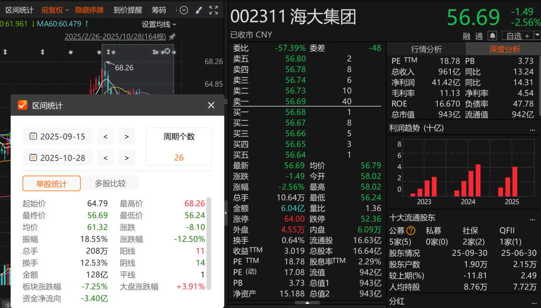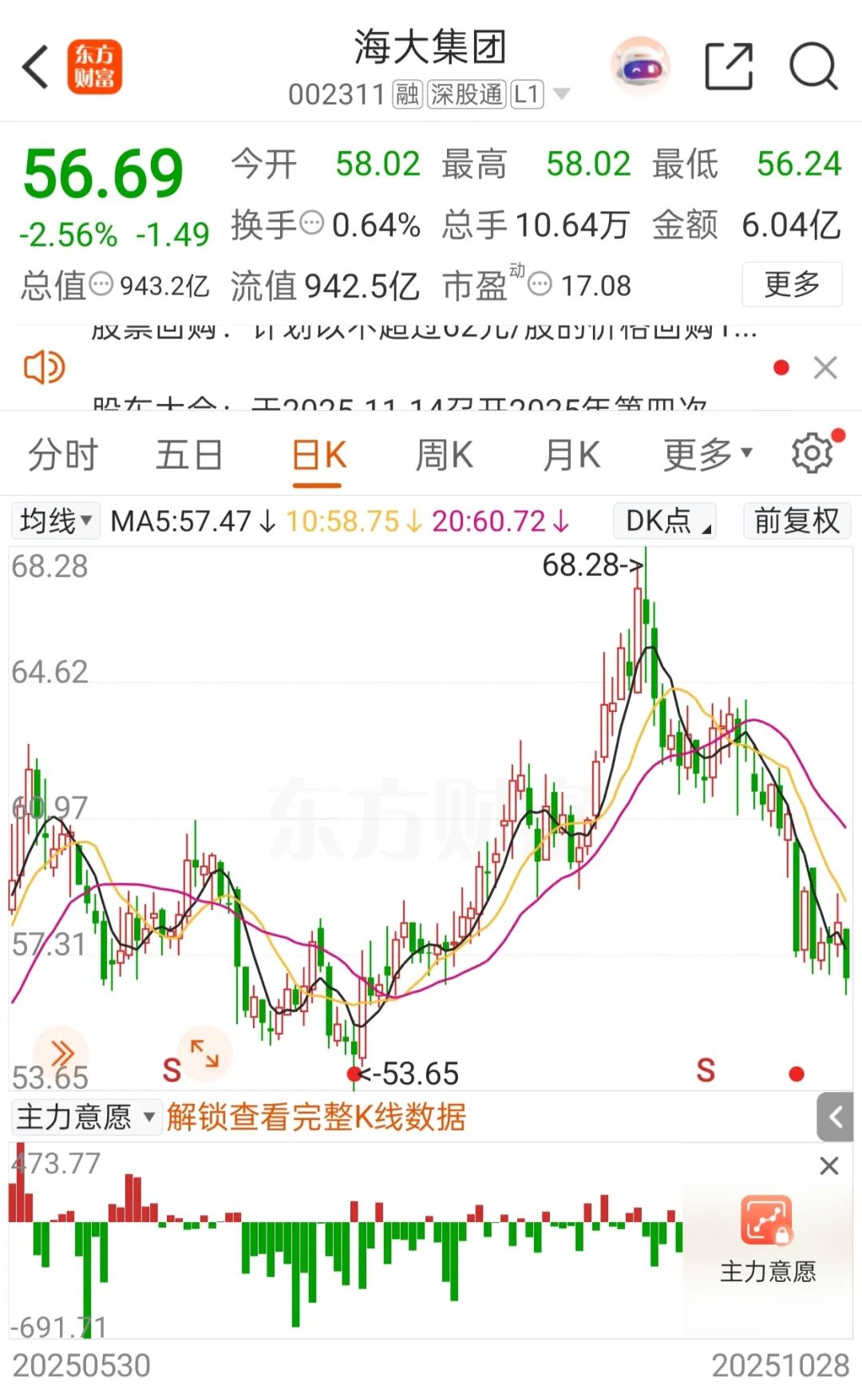 截至10月28日收盘,海大集团报56.69元/股,下跌2.56%,总市值为943亿元。