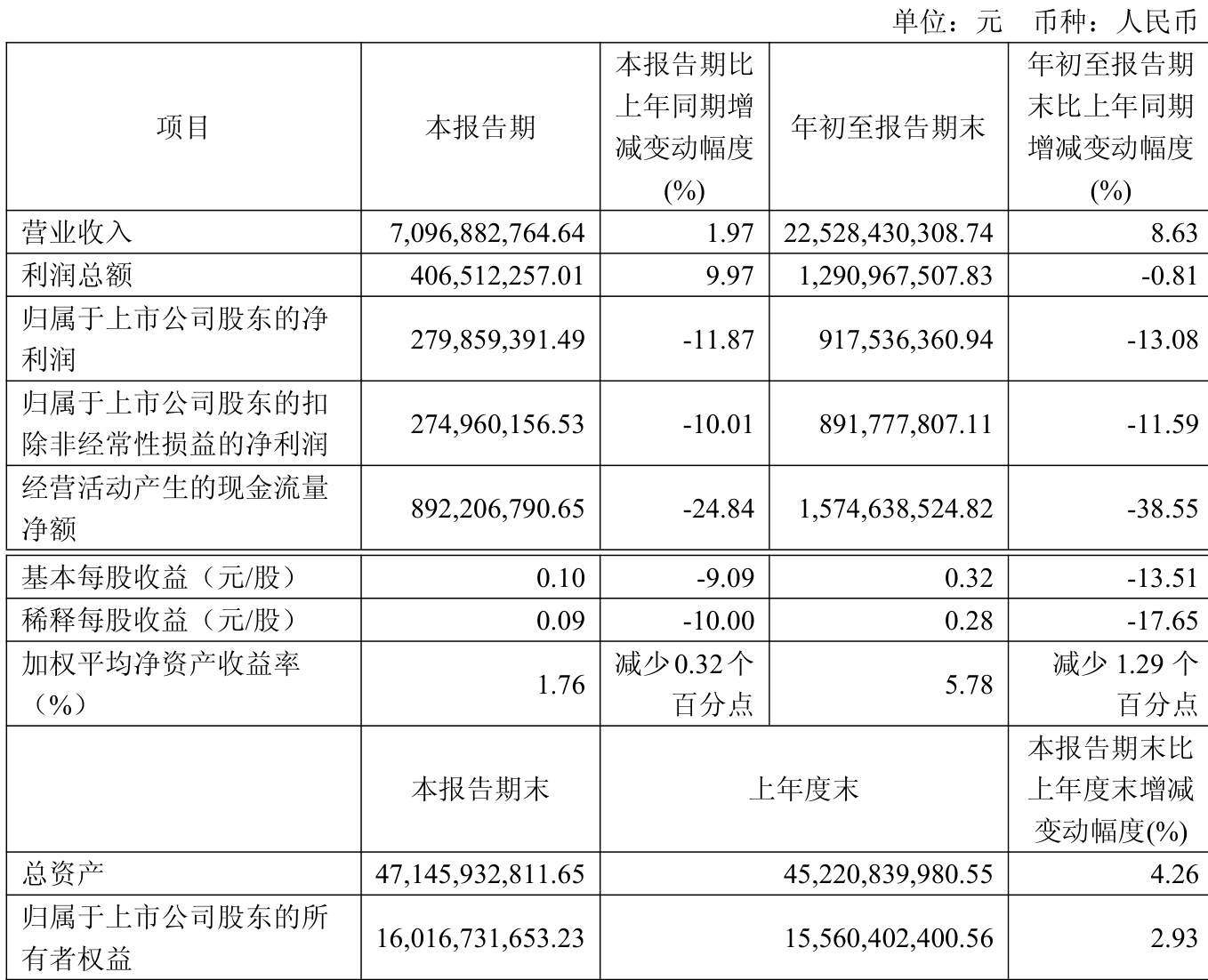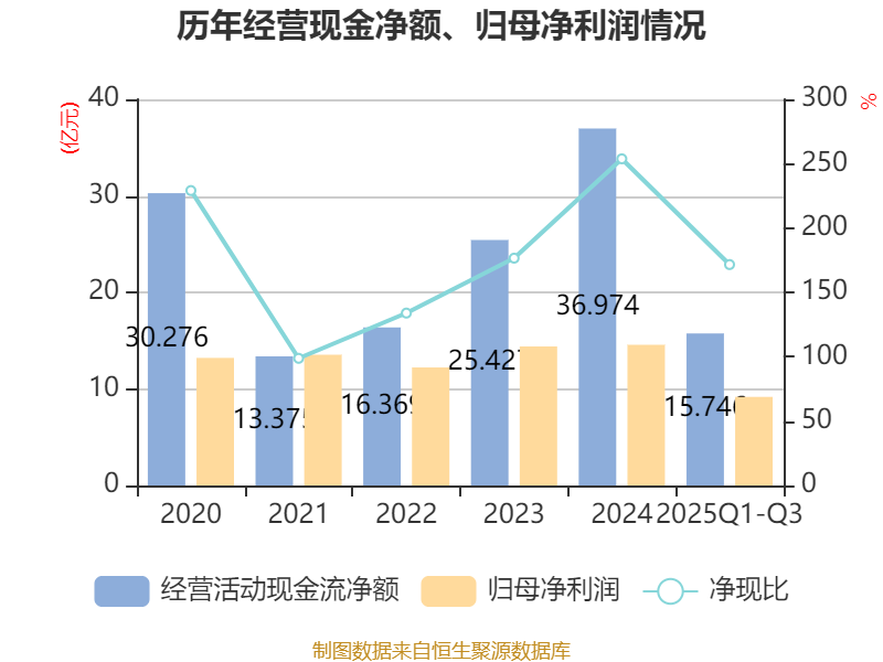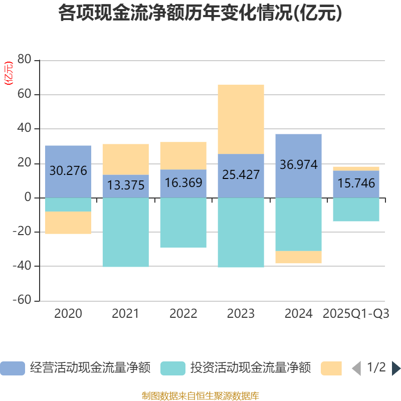 2025年前三季度,公司经营活动现金流净额为15.75亿元,同比下降38.55%;筹资活动现金流净额2.21亿元,同比增加8.96亿元;投资活动现金流净额-13.74亿元,上年同期为-19.82亿元。