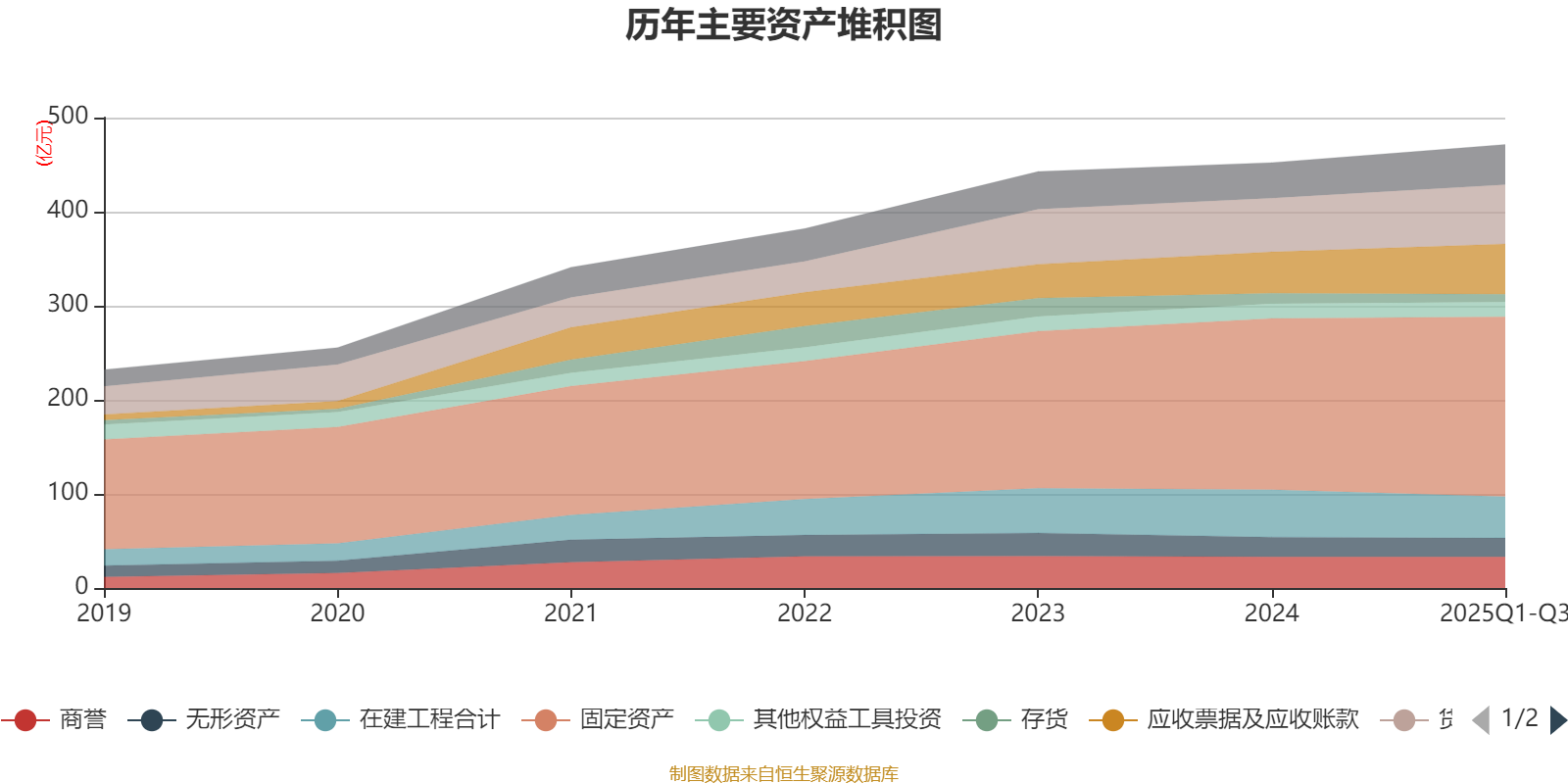资产重大变化方面,截至2025年三季度末,公司在建工程合计较上年末减少12.85%,占公司总资产比重下降1.83个百分点;应收票据及应收账款较上年末增加21.39%,占公司总资产比重上升1.6个百分点;预付款项较上年末增加47.03%,占公司总资产比重上升0.87个百分点;货币资金较上年末增加10.29%,占公司总资产比重上升0.73个百分点。