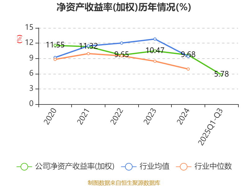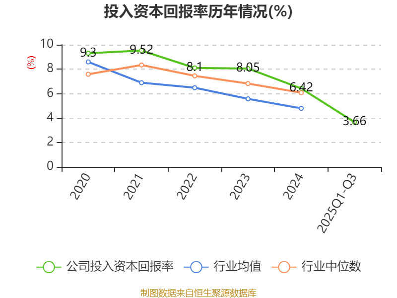 盈利能力方面, 2025年前三季度公司加权平均净资产收益率为5.78%,同比下降1.29个百分点。公司2025年前三季度投入资本回报率为3.66%,较上年同期下降1.51个百分点。