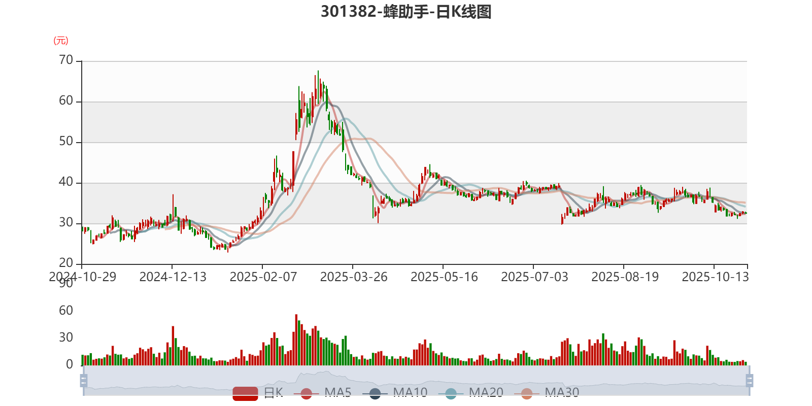 以10月28日收盘价计算,蜂助手目前市盈率(TTM)约为52.55倍,市净率(LF)约5.01倍,市销率(TTM)约4.65倍。