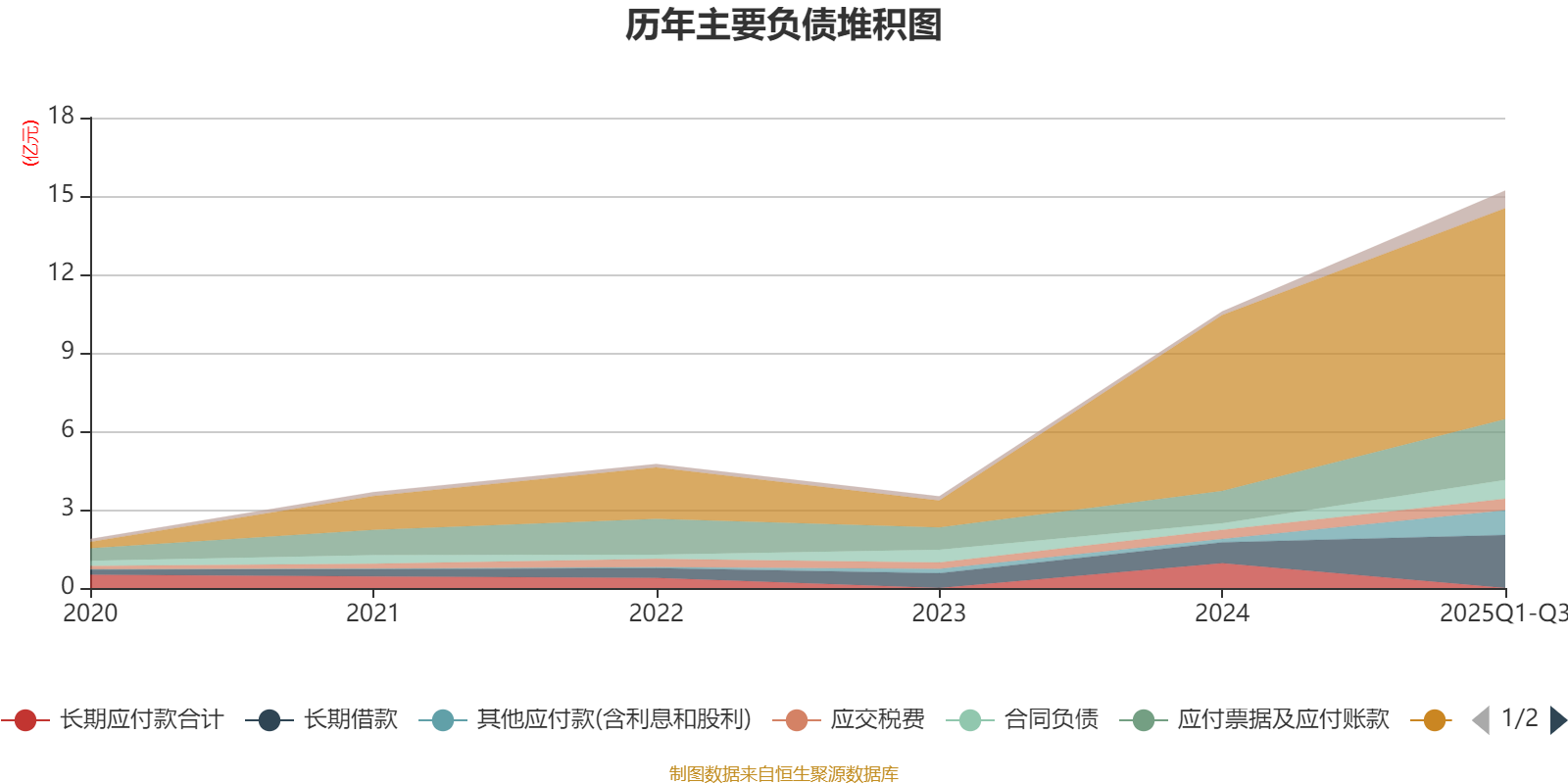 负债重大变化方面,截至2025年三季度末,公司长期借款较上年末增加153.46%,占公司总资产比重上升3.28个百分点;长期应付款合计较上年末减少100%,占公司总资产比重下降3.22个百分点;应付票据及应付账款较上年末增加88.8%,占公司总资产比重上升2.7个百分点;其他应付款(含利息和股利)较上年末增加624.9%,占公司总资产比重上升2.36个百分点。