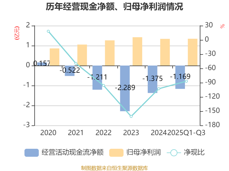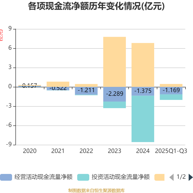 2025年前三季度,公司经营活动现金流净额为-1.17亿元,同比增加1.68亿元;筹资活动现金流净额4490.07万元,同比减少5.37亿元;投资活动现金流净额-8604.84万元,上年同期为-7.01亿元。