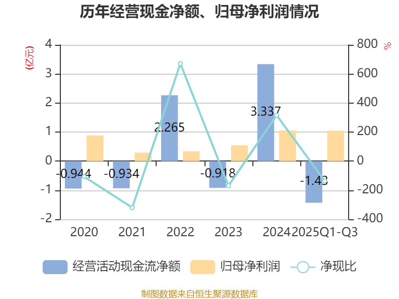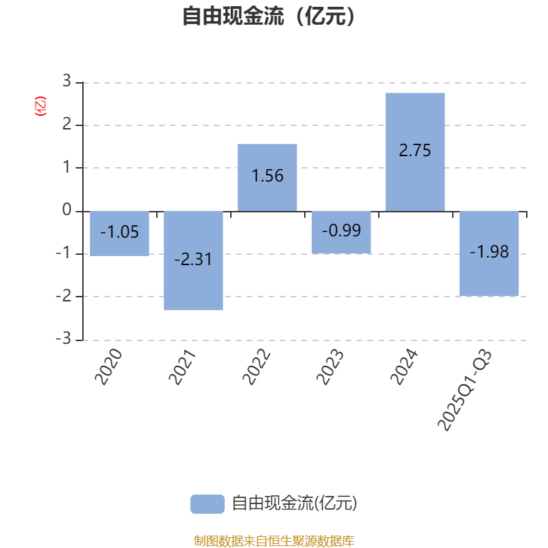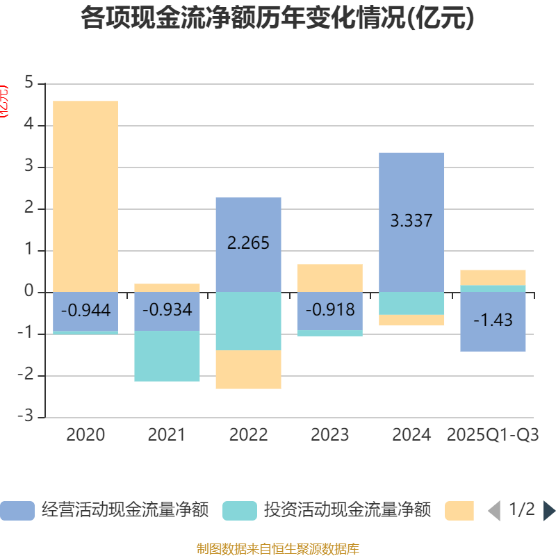 2025年前三季度,公司经营活动现金流净额为-1.43亿元,同比减少3.6亿元;筹资活动现金流净额3614.63万元,同比增加1.2亿元;投资活动现金流净额1616.76万元,上年同期为-4037.94万元。