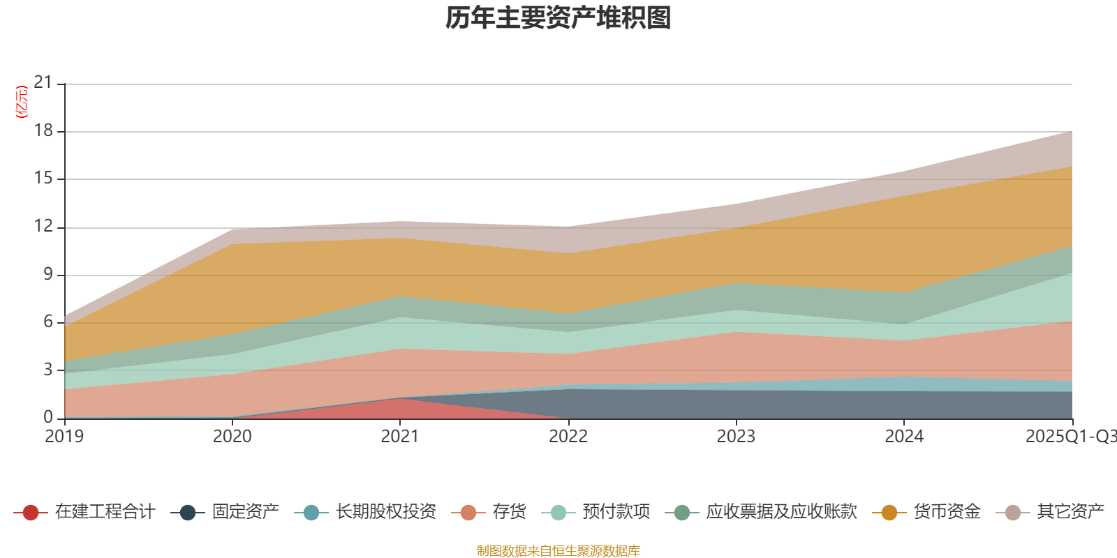 资产重大变化方面,截至2025年三季度末,公司货币资金较上年末减少17.92%,占公司总资产比重下降11.52个百分点;预付款项较上年末增加194.49%,占公司总资产比重上升10.13个百分点;存货较上年末增加66.38%,占公司总资产比重上升6.26个百分点;应收票据及应收账款较上年末减少15.37%,占公司总资产比重下降3.5个百分点。
