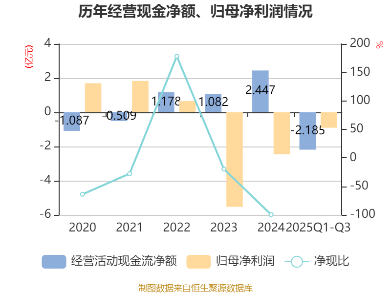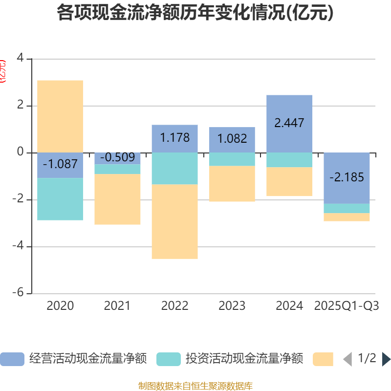 2025年前三季度,公司经营活动现金流净额为-2.18亿元,同比减少4333.48万元;筹资活动现金流净额-3406.16万元,同比增加4628.74万元;投资活动现金流净额-4021.22万元,上年同期为69.19万元。