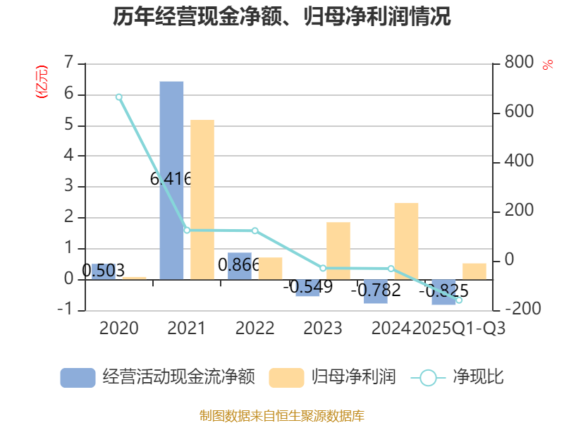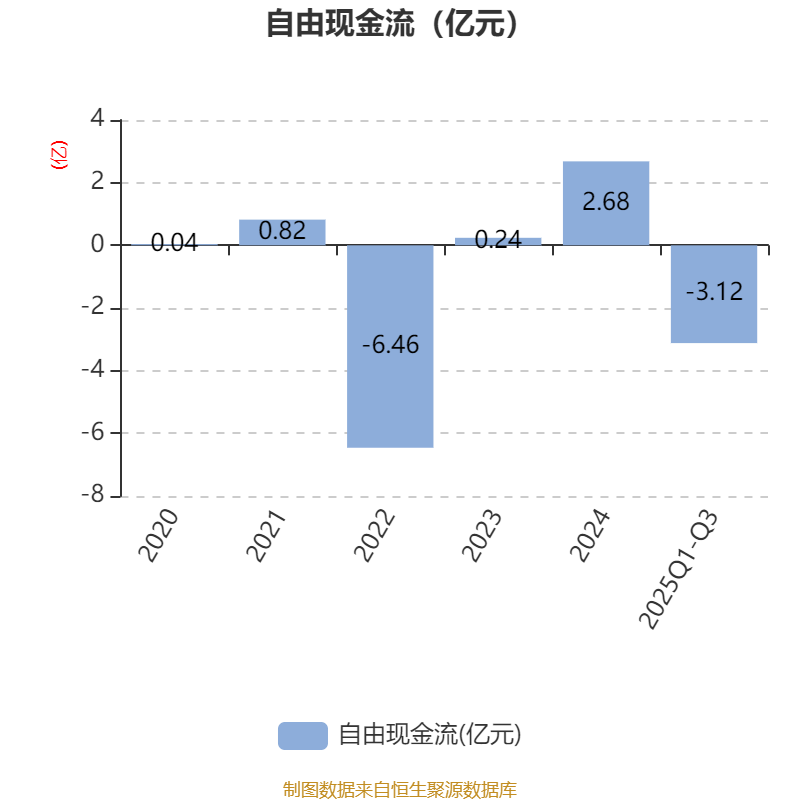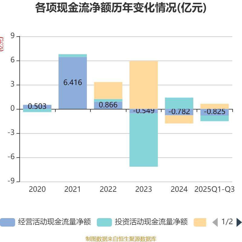 2025年前三季度,公司经营活动现金流净额为-8250.14万元,同比减少1.98亿元;筹资活动现金流净额6337.97万元,同比增加4.77亿元;投资活动现金流净额-6979.83万元,上年同期为2.33亿元。
