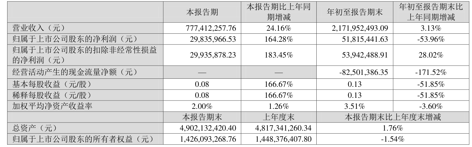 中证智能财讯宝鼎科技(002552)10月29日披露2025年第三季度报告。前三季度公司实现营业总收入21.72亿元,同比增长3.13%;归母净利润5181.54万元,同比下降53.96%;扣非净利润5394.25万元,同比增长28.02%;经营活动产生的现金流量净额为-8250.14万元,上年同期为1.15亿元;报告期内,宝鼎科技基本每股收益为0.13元,加权平均净资产收益率为3.51%。