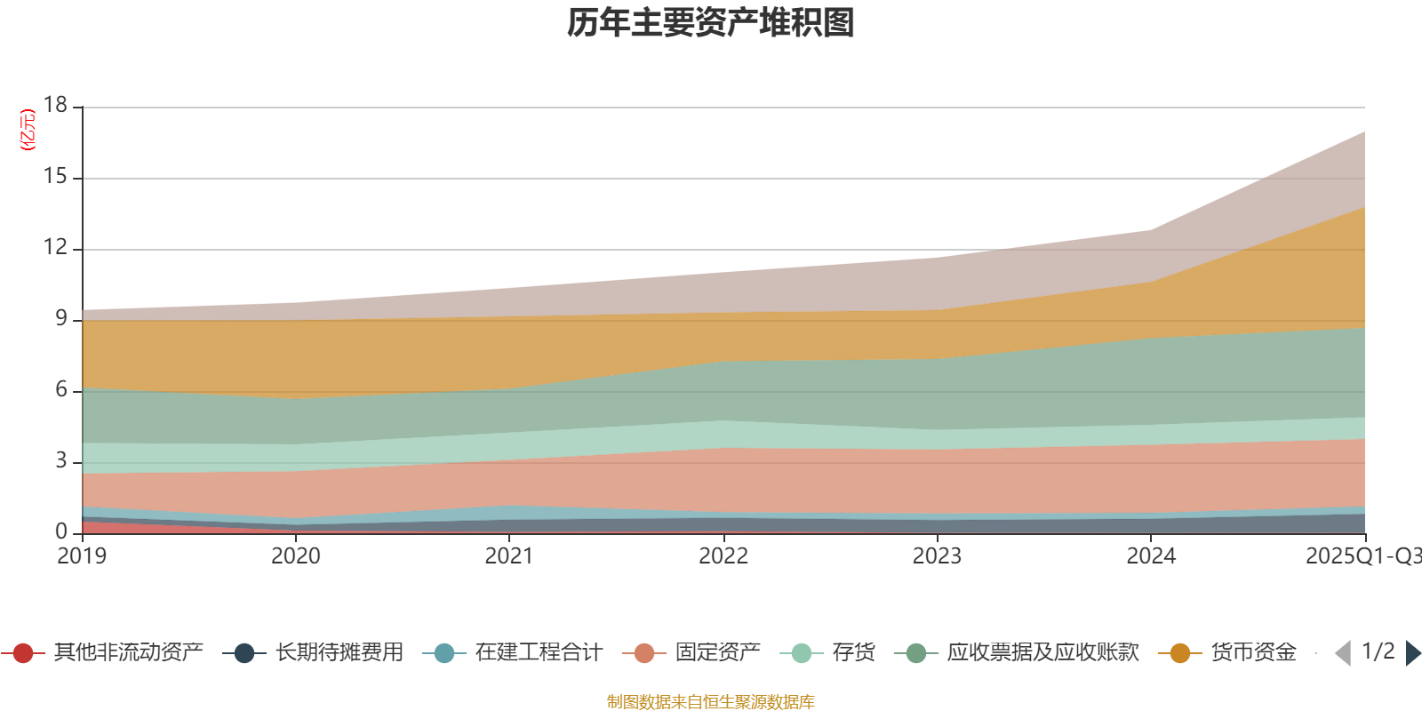 资产重大变化方面,截至2025年三季度末,公司货币资金较上年末增加115.18%,占公司总资产比重上升11.56个百分点;应收票据及应收账款较上年末增加3.04%,占公司总资产比重下降6.37个百分点;固定资产较上年末减少1.19%,占公司总资产比重下降5.72个百分点;交易性金融资产合计较上年末增加89775.57%,占公司总资产比重上升2.93个百分点。