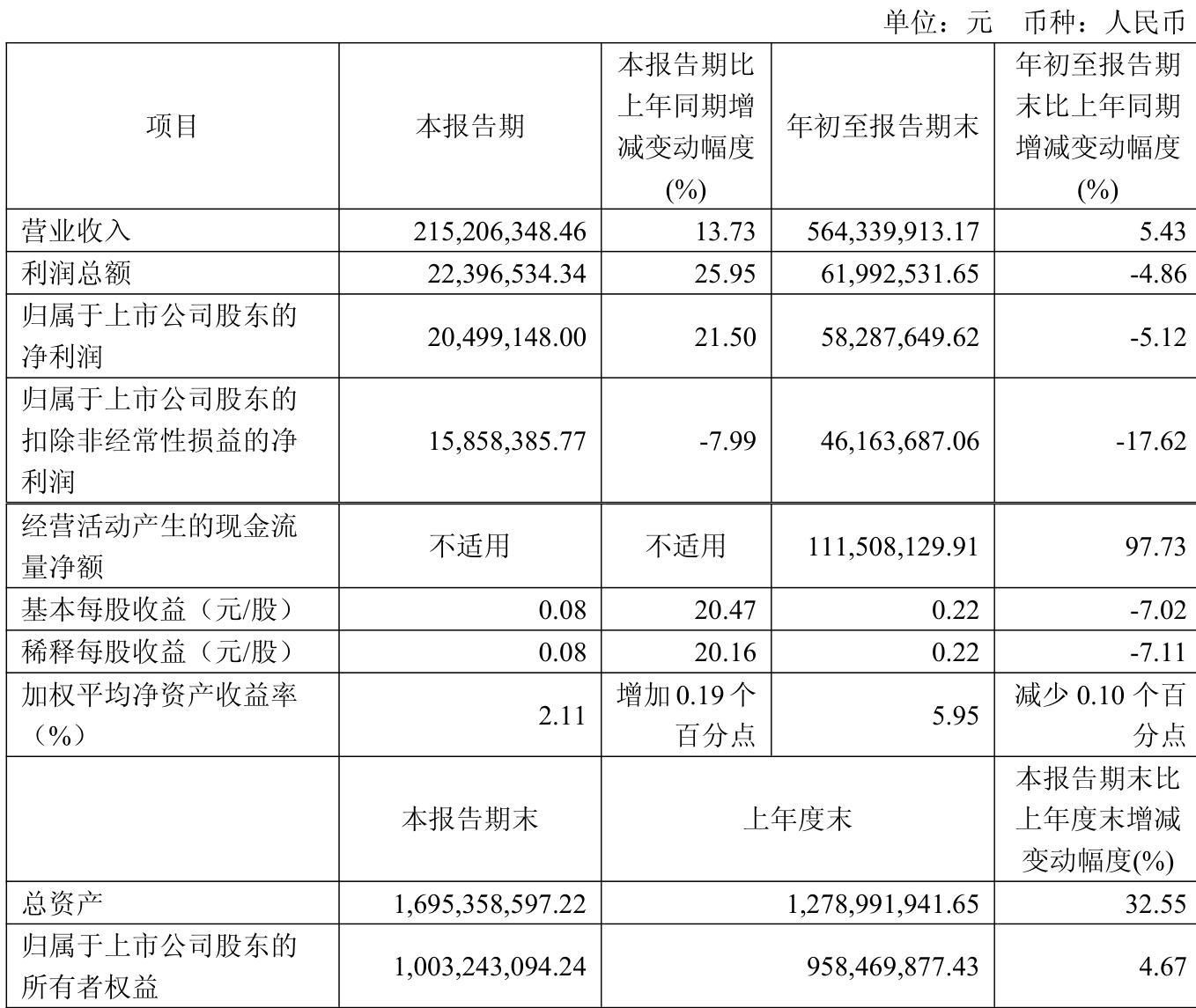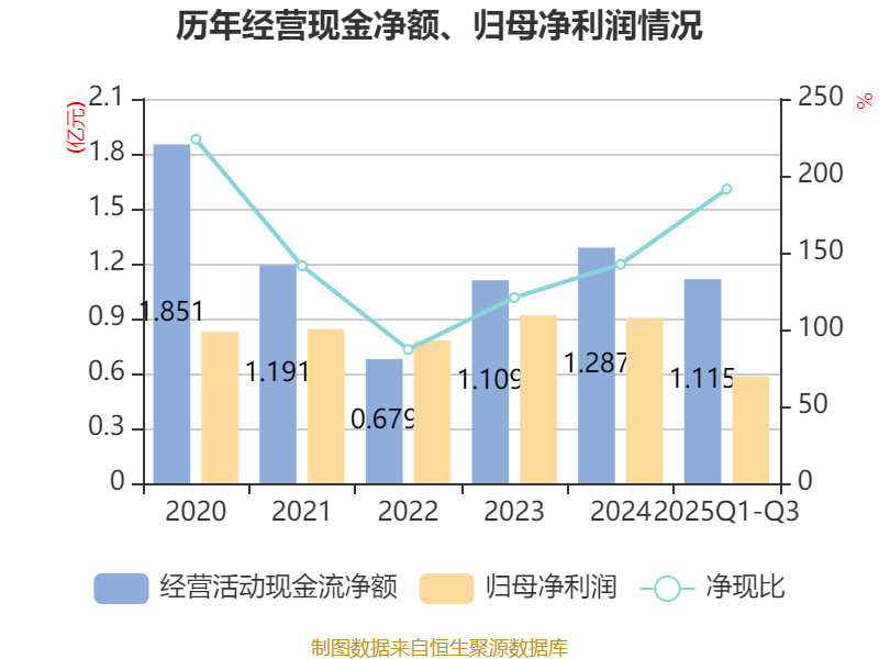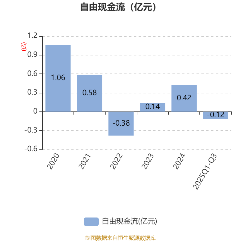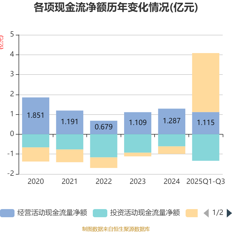 2025年前三季度,公司经营活动现金流净额为1.12亿元,同比增长97.73%;筹资活动现金流净额2.97亿元,同比增加2.98亿元;投资活动现金流净额-1.34亿元,上年同期为-4101.48万元。