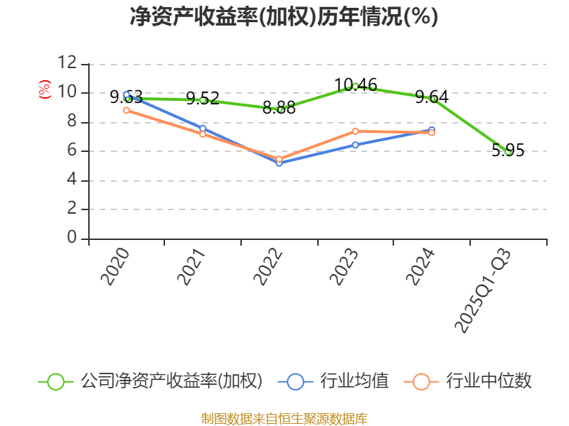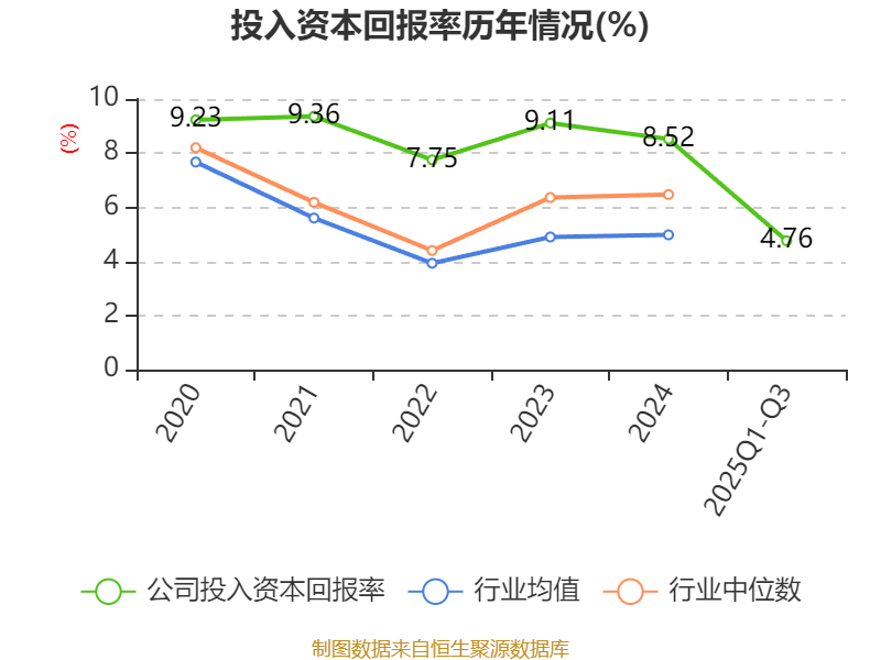 盈利能力方面, 2025年前三季度公司加权平均净资产收益率为5.95%,同比下降0.65个百分点。公司2025年前三季度投入资本回报率为4.76%,较上年同期下降1.17个百分点。