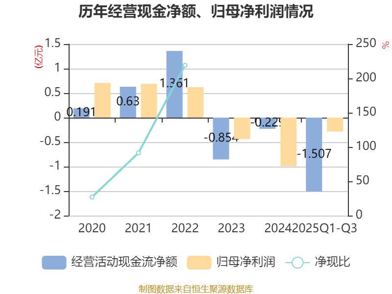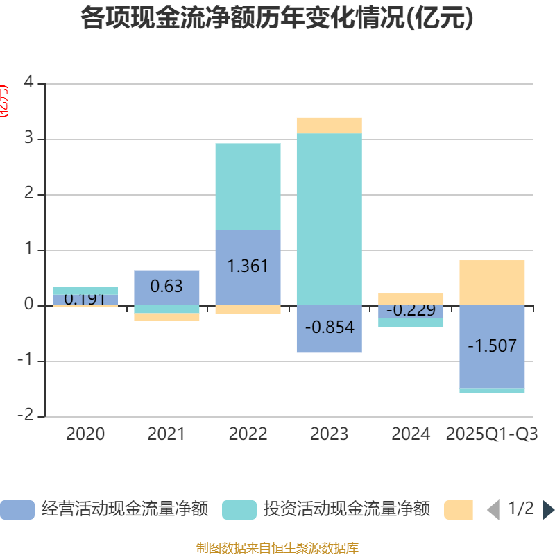 2025年前三季度,公司经营活动现金流净额为-1.51亿元,同比减少1.3亿元;筹资活动现金流净额8120.09万元,同比增加5699.12万元;投资活动现金流净额-783.39万元,上年同期为-1486.3万元。