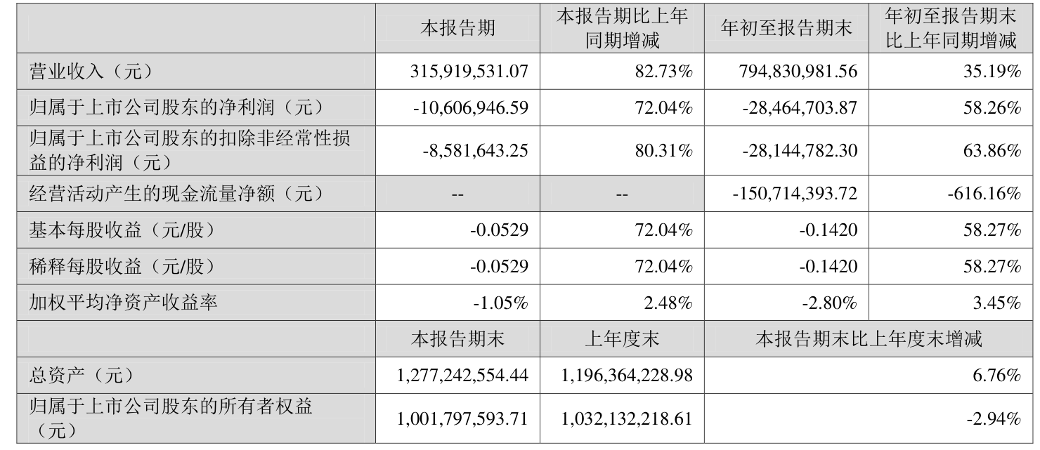 中证智能财讯朗科科技(300042)10月29日披露2025年第三季度报告。前三季度公司实现营业总收入7.95亿元,同比增长35.19%;归母净利润亏损2846.47万元,上年同期亏损6820.03万元;扣非净利润亏损2814.48万元,上年同期亏损7786.66万元;经营活动产生的现金流量净额为-1.51亿元,上年同期为-2104.49万元;报告期内,朗科科技基本每股收益为-0.142元,加权平均净资产收益率为-2.80%。