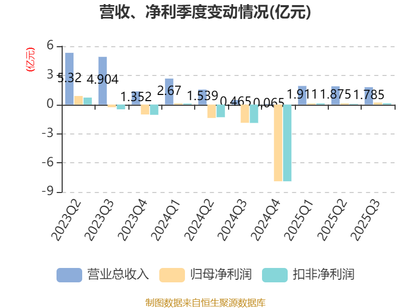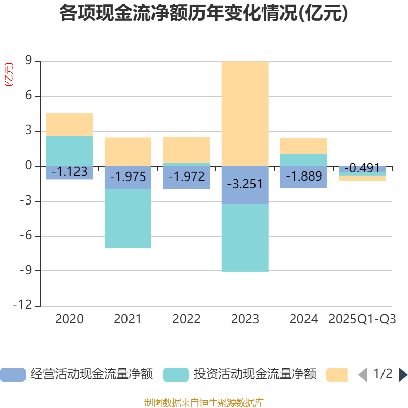 2025年前三季度,公司经营活动现金流净额为-4908.78万元,同比增加1.37亿元;筹资活动现金流净额-4365.25万元,同比减少3.35亿元;投资活动现金流净额-3488.31万元,上年同期为5530.77万元。