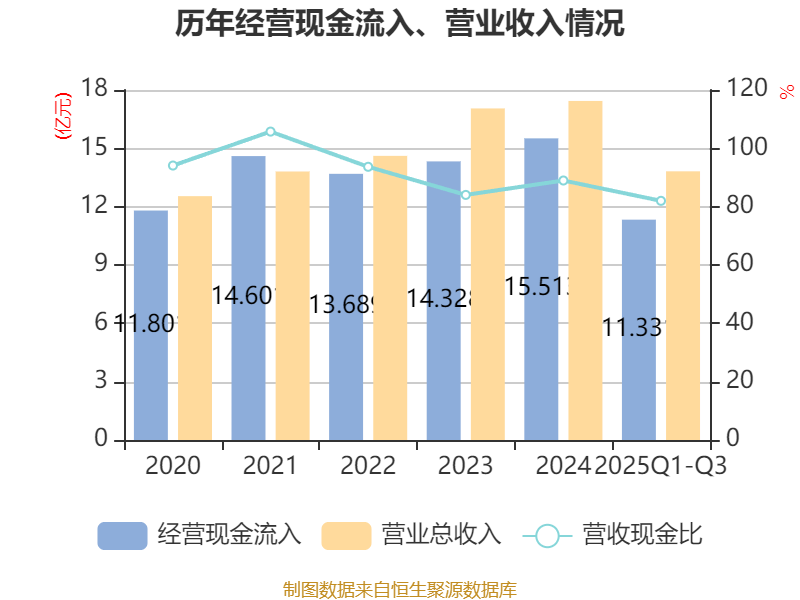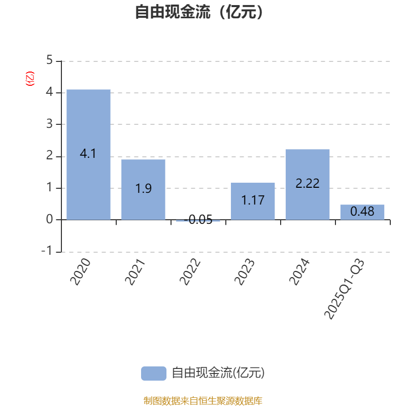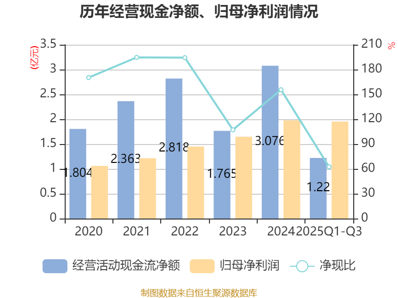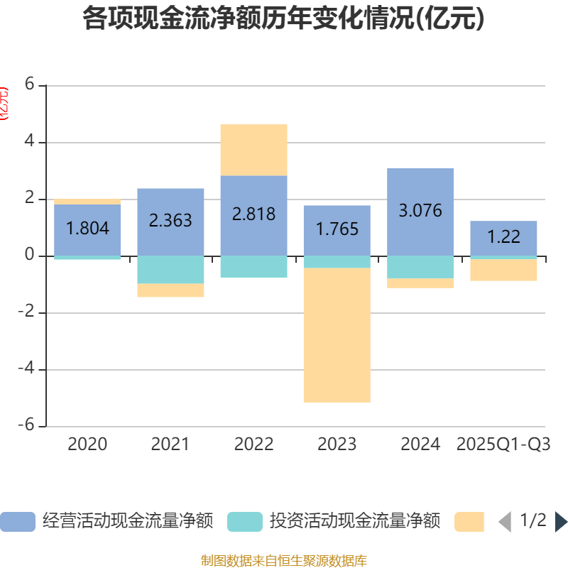 2025年前三季度,公司经营活动现金流净额为1.22亿元,同比下降56.67%;筹资活动现金流净额-7560.03万元,同比减少2983.68万元;投资活动现金流净额-1329.53万元,上年同期为-2509.59万元。