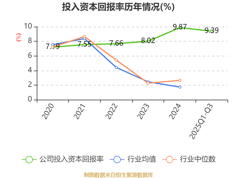 盈利能力方面, 2025年前三季度公司加权平均净资产收益率为9.89%,同比上升1.88个百分点。公司2025年前三季度投入资本回报率为9.39%,较上年同期上升1.78个百分点。