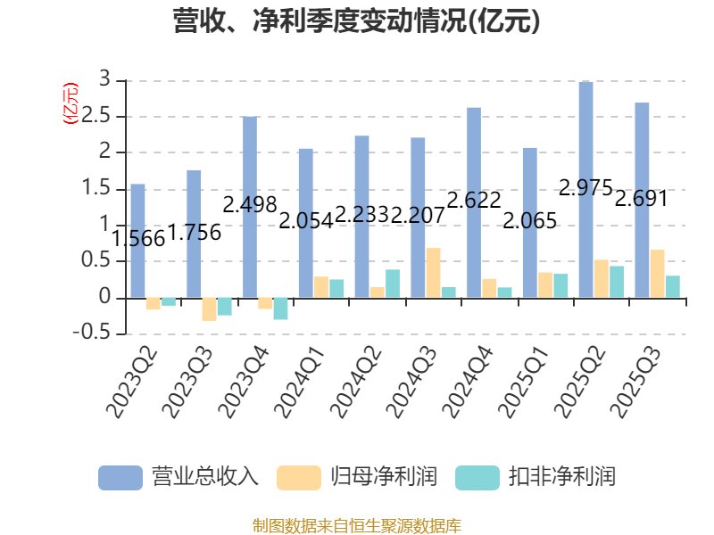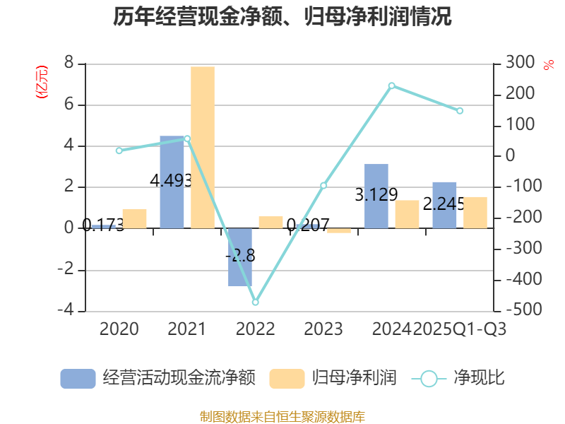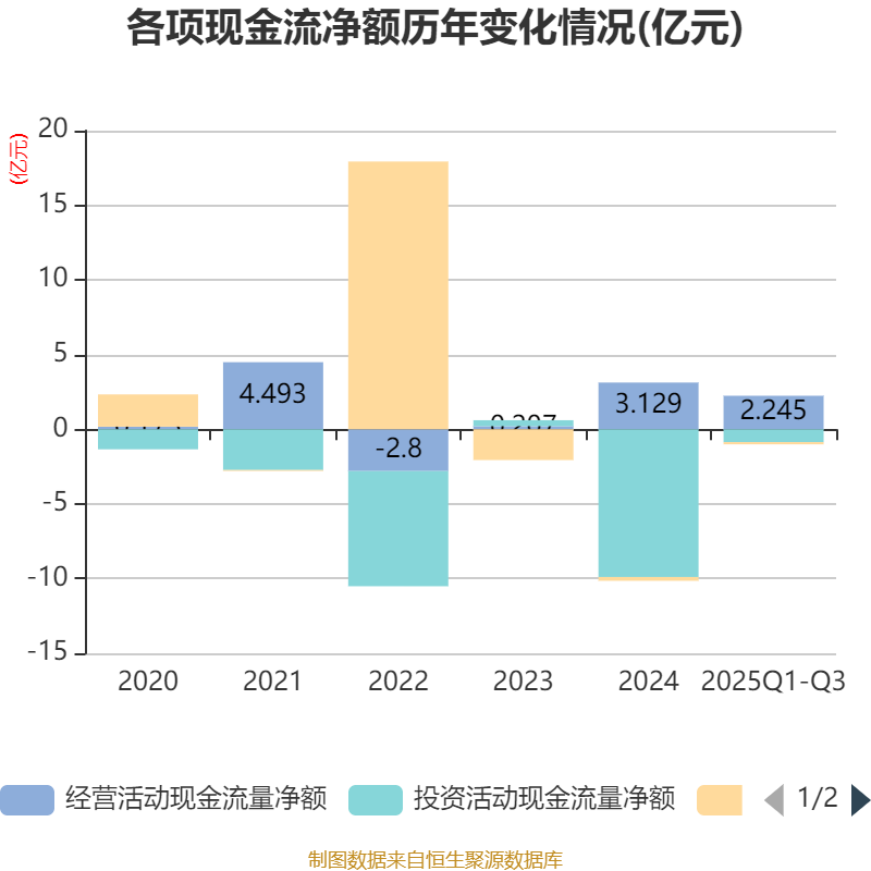 2025年前三季度,公司经营活动现金流净额为2.24亿元,同比增长18.17%;筹资活动现金流净额-1472.51万元,同比增加1.05亿元;投资活动现金流净额-8603.86万元,上年同期为-8.1亿元。
