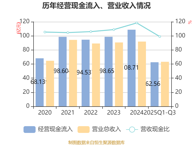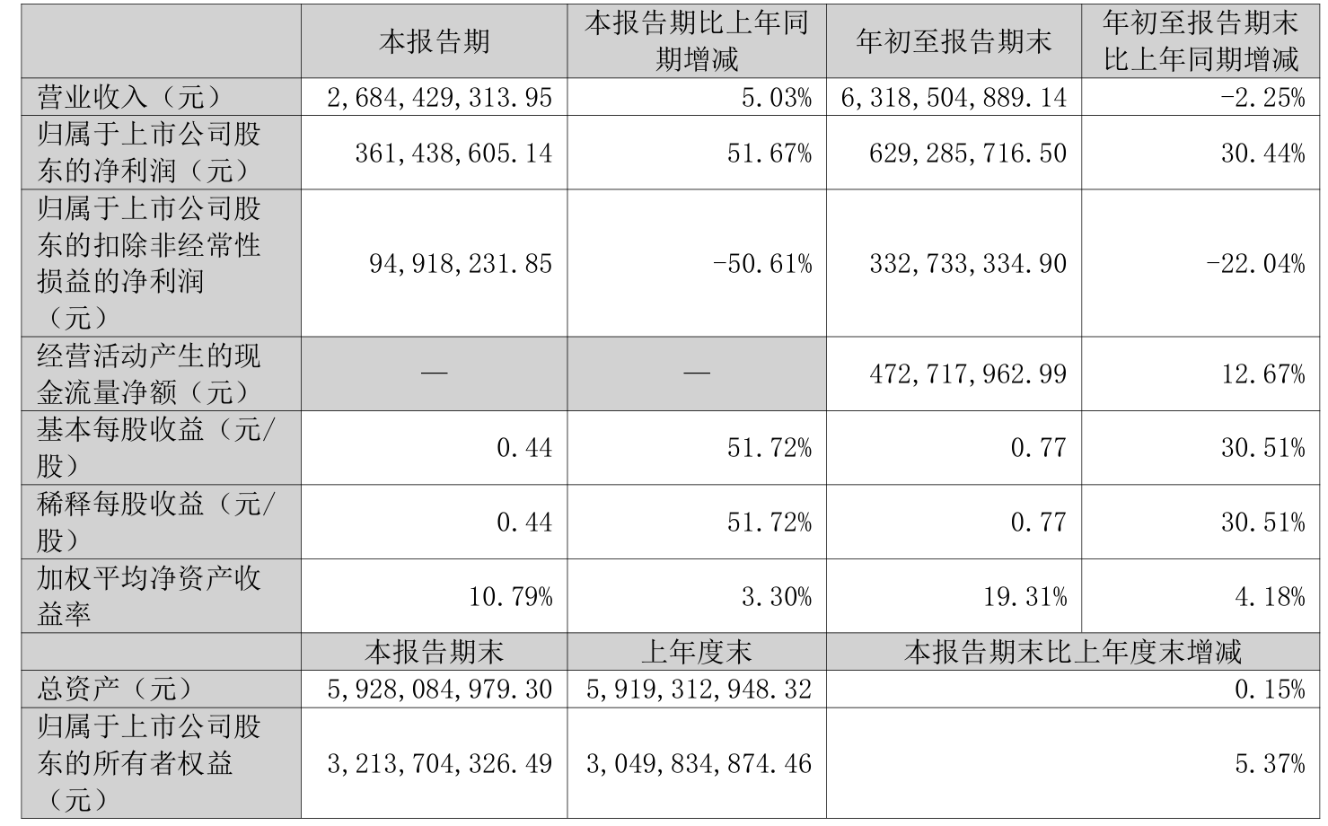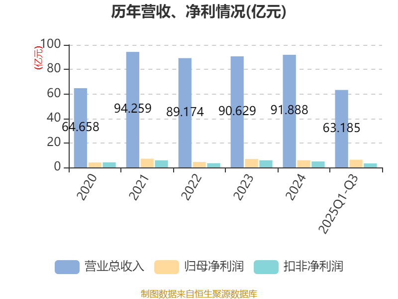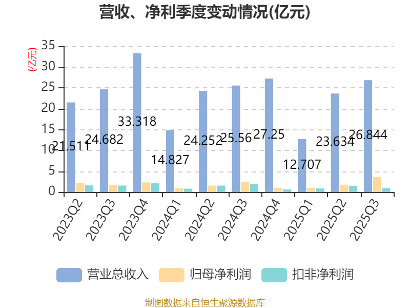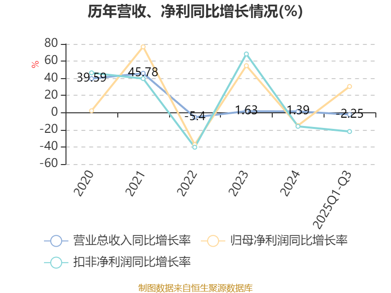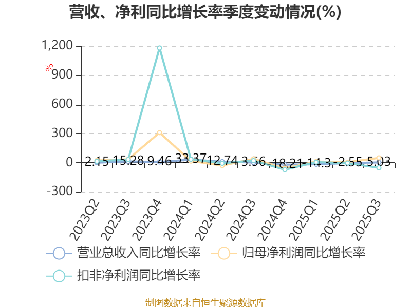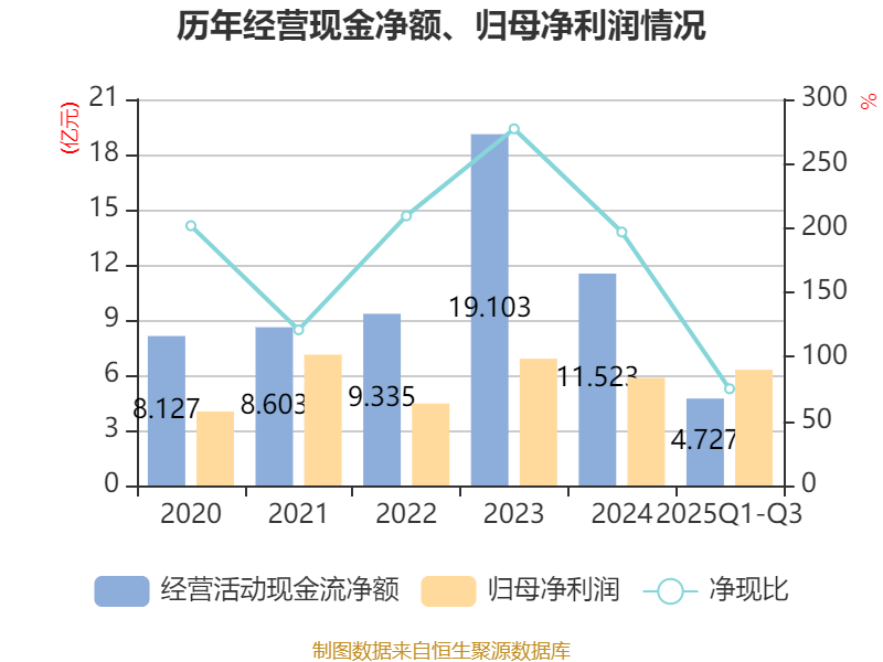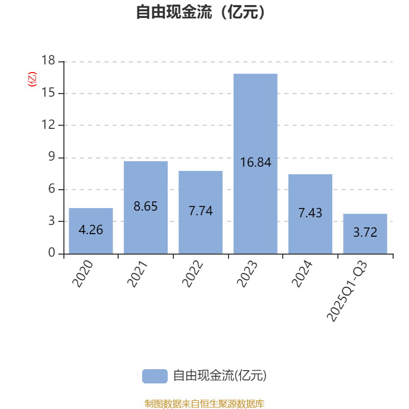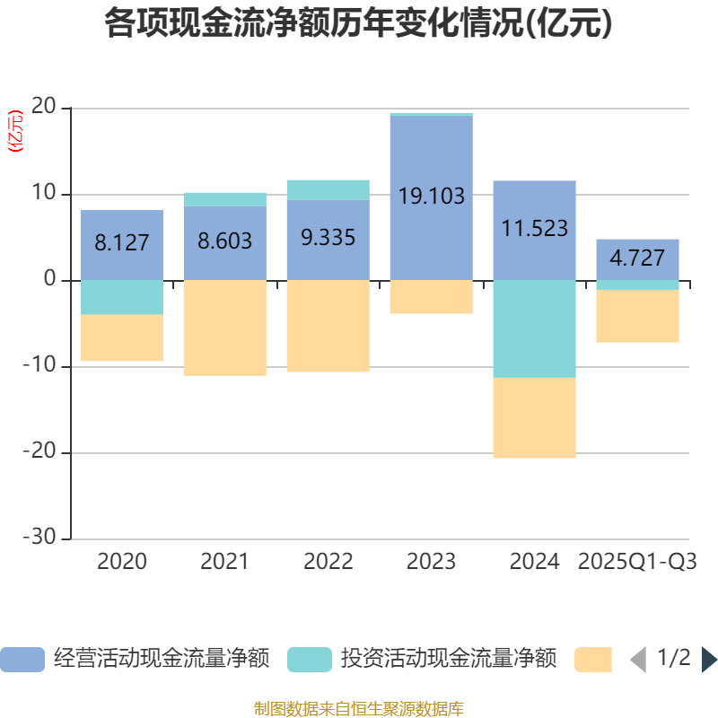 2025年前三季度,公司经营活动现金流净额为4.73亿元,同比增长12.67%;筹资活动现金流净额-6.12亿元,同比增加2.99亿元;投资活动现金流净额-1.14亿元,上年同期为-1.83亿元。