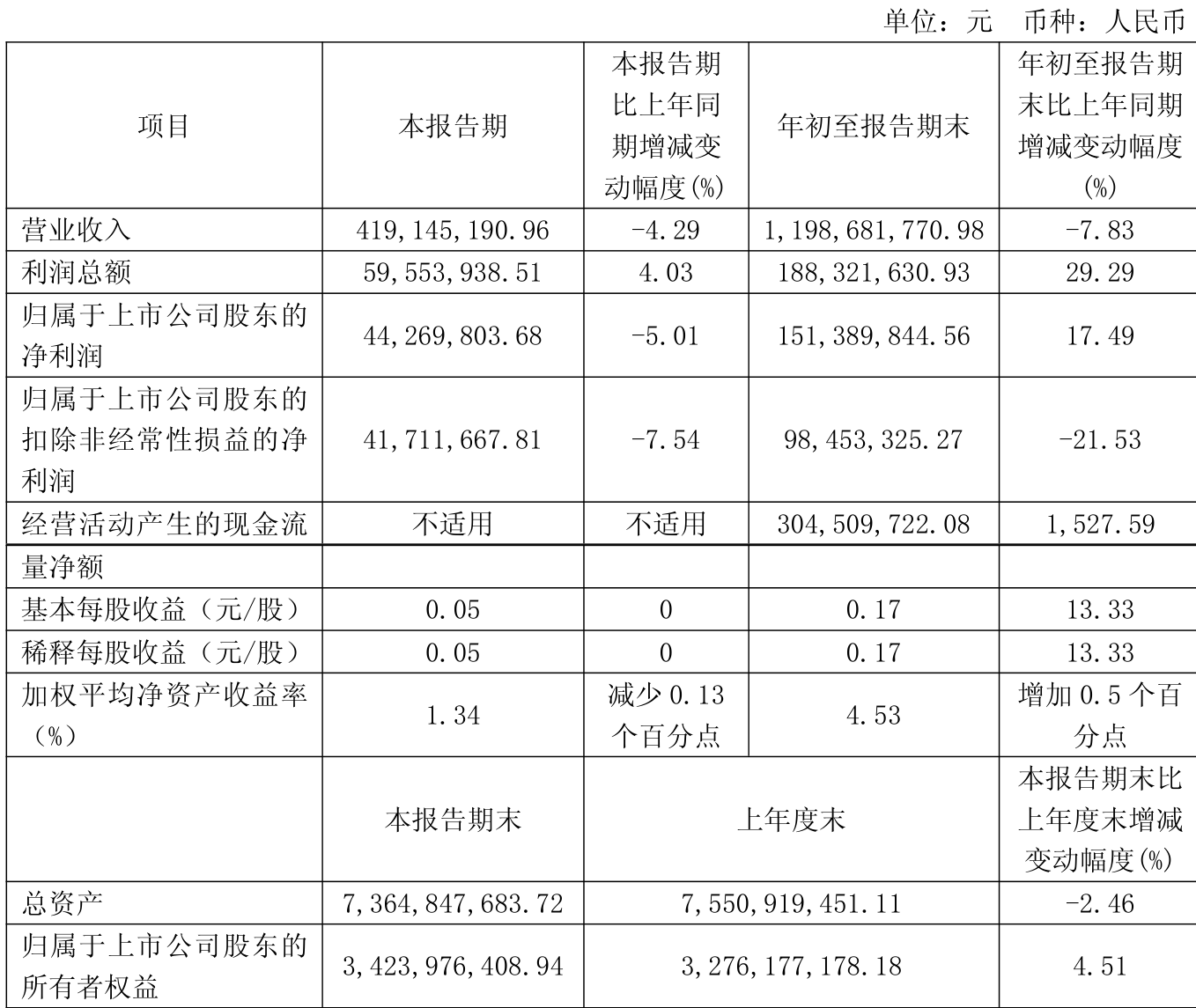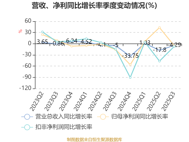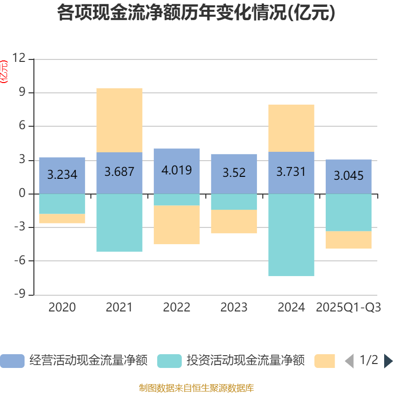 2025年前三季度,公司经营活动现金流净额为3.05亿元,同比增长1527.59%;筹资活动现金流净额-1.54亿元,同比减少7.32亿元;投资活动现金流净额-3.35亿元,上年同期为-5.74亿元。