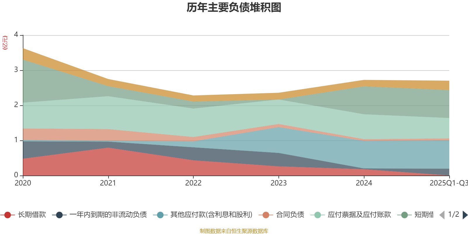 负债重大变化方面,截至2025年三季度末,公司长期借款较上年末减少100%,占公司总资产比重下降2.46个百分点;一年内到期的非流动负债较上年末增加853.83%,占公司总资产比重上升2.42个百分点;应付票据及应付账款较上年末减少18.06%,占公司总资产比重下降1.59个百分点;长期应付款合计占公司总资产的1.35%,上年末为0。