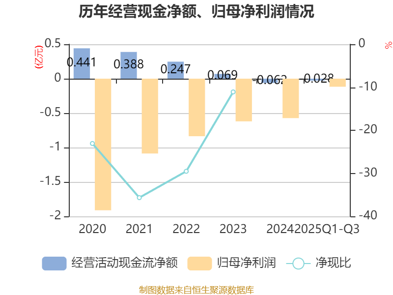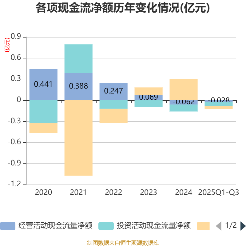 2025年前三季度,公司经营活动现金流净额为-281.46万元,同比增加2018.54万元;筹资活动现金流净额-432.31万元,同比减少3635.77万元;投资活动现金流净额-548.75万元,上年同期为-613.21万元。