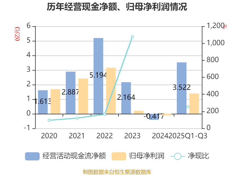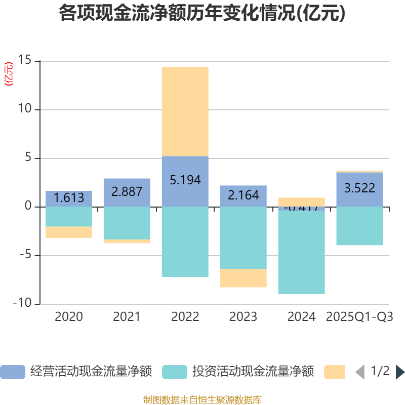 2025年前三季度,公司经营活动现金流净额为3.52亿元,同比增加3.59亿元;筹资活动现金流净额1568.24万元,同比减少7366.6万元;投资活动现金流净额-3.97亿元,上年同期为-8.24亿元。