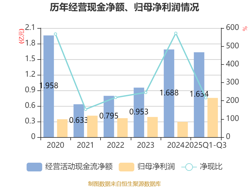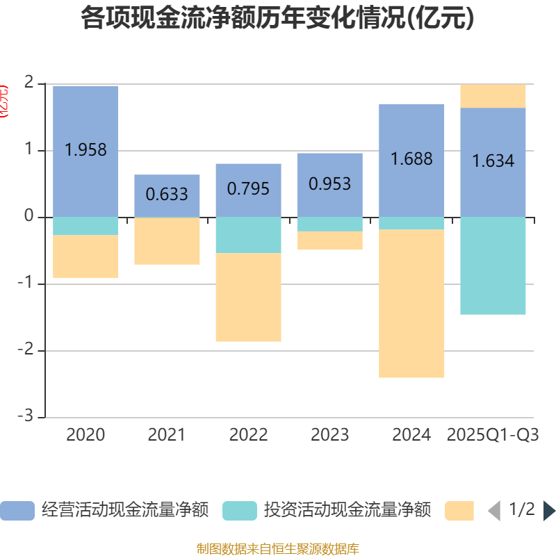 2025年前三季度,公司经营活动现金流净额为1.63亿元,同比增长50.99%;筹资活动现金流净额3495.13万元,同比增加2.14亿元;投资活动现金流净额-1.46亿元,上年同期为632.31万元。