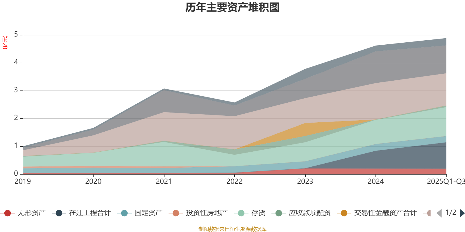 资产重大变化方面,截至2025年三季度末,公司在建工程合计较上年末增加48.46%,占公司总资产比重上升5.59个百分点;应收票据及应收账款较上年末减少11.49%,占公司总资产比重下降4.63个百分点;货币资金较上年末减少12.08%,占公司总资产比重下降4.17个百分点;存货较上年末增加19.56%,占公司总资产比重上升2.46个百分点。