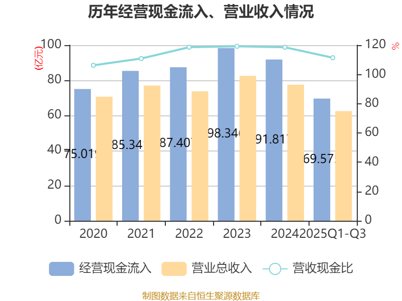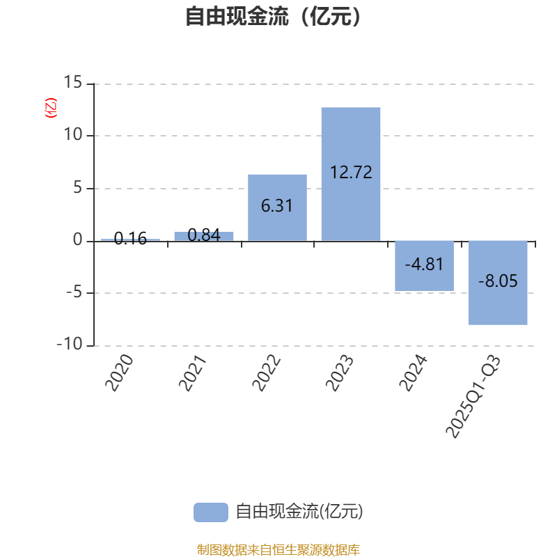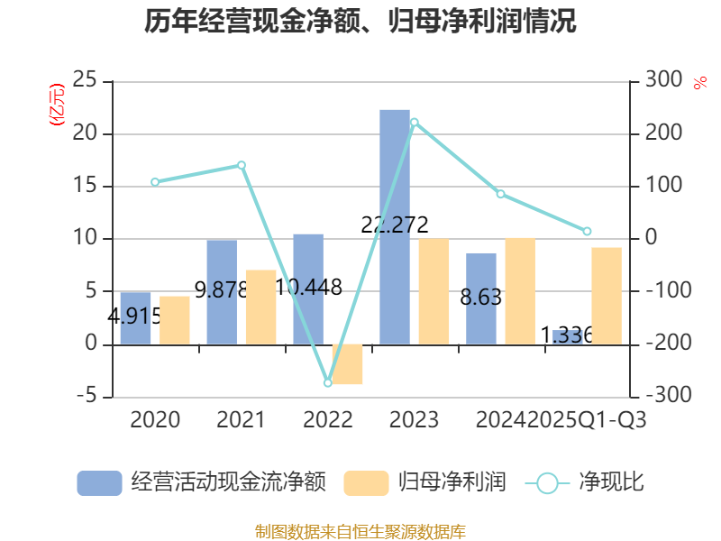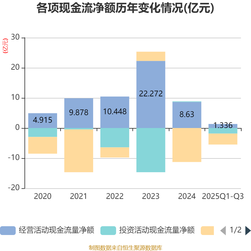 2025年前三季度,公司经营活动现金流净额为1.34亿元,同比下降48.38%;筹资活动现金流净额-3.64亿元,同比减少5887.53万元;投资活动现金流净额-1.84亿元,上年同期为-2.17亿元。