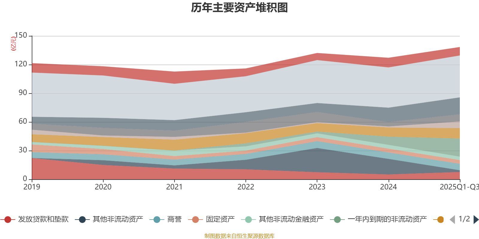 资产重大变化方面,截至2025年三季度末,公司其他非流动资产较上年末减少89.17%,占公司总资产比重下降11.55个百分点;一年内到期的非流动资产较上年末增加120.93%,占公司总资产比重上升6.94个百分点;交易性金融资产合计较上年末增加525.24%,占公司总资产比重上升4.15个百分点;其他应收款(含利息和股利)较上年末增加64.69%,占公司总资产比重上升1.85个百分点。