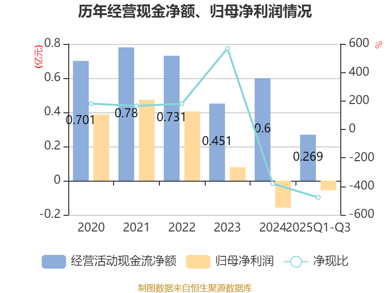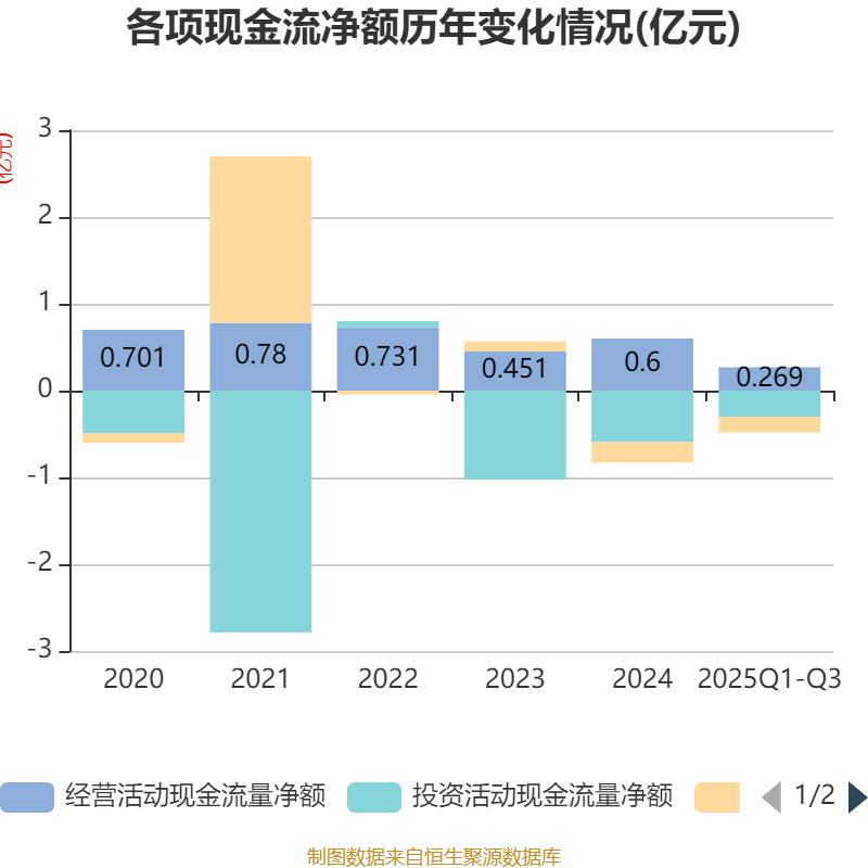 2025年前三季度,公司经营活动现金流净额为2686.12万元,同比下降17.6%;筹资活动现金流净额-1819.93万元,同比增加156.68万元;投资活动现金流净额-3016.41万元,上年同期为-3683.48万元。