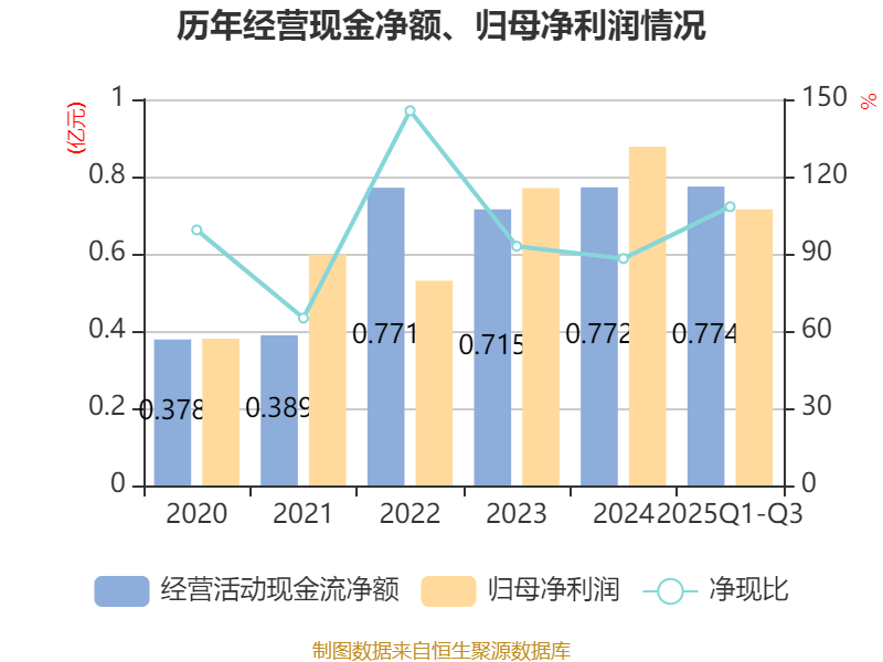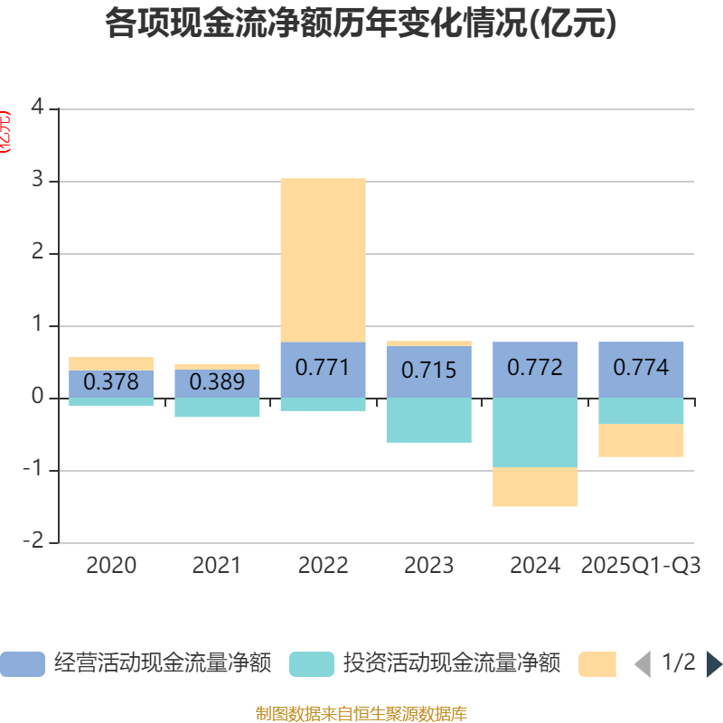 2025年前三季度,公司经营活动现金流净额为7737.1万元,同比增长32.91%;筹资活动现金流净额-4566.6万元,同比增加752.31万元;投资活动现金流净额-3637.27万元,上年同期为-3亿元。