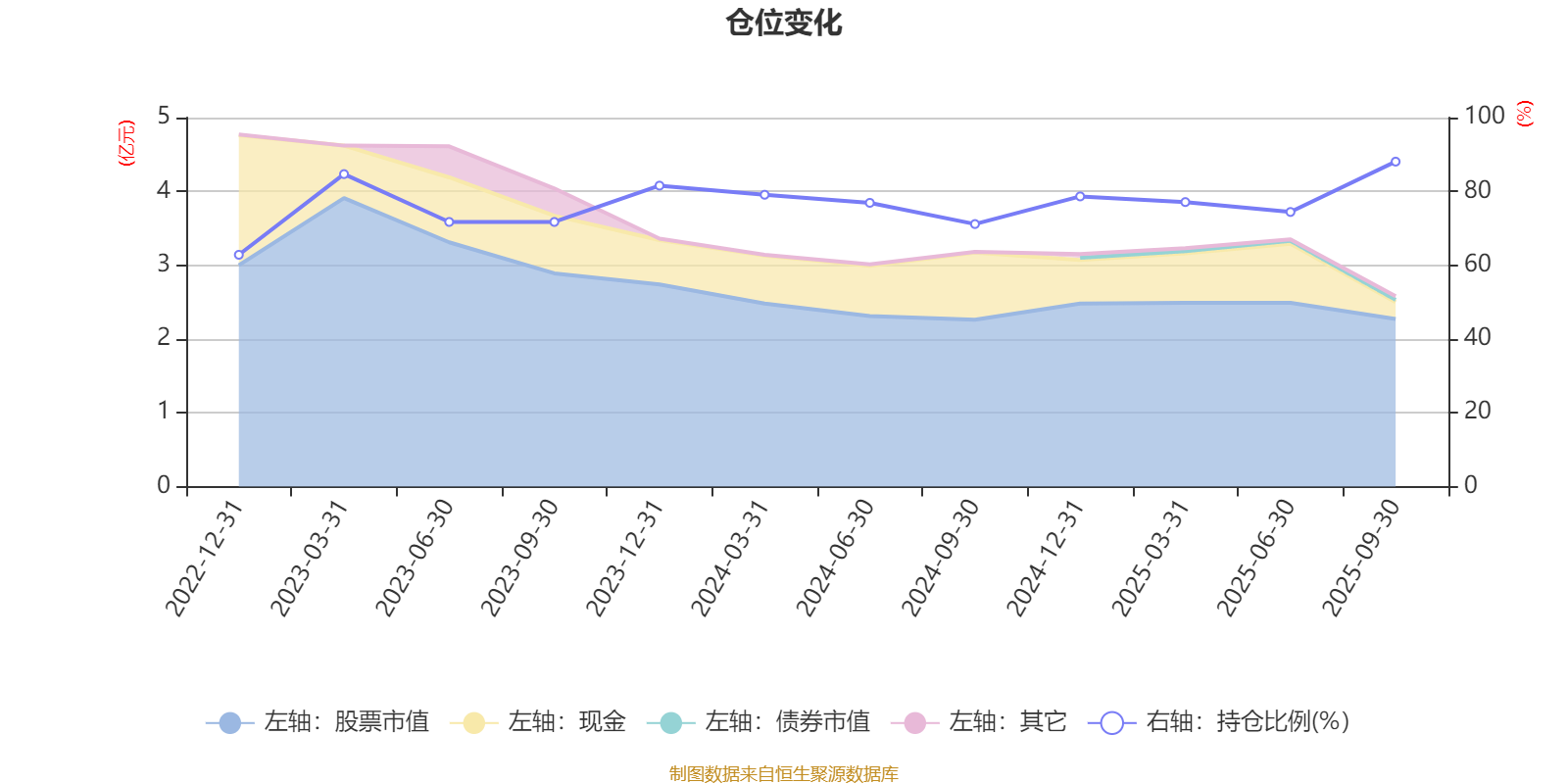 据定期报告数据统计,近三年平均股票仓位为76.49%,同类平均为85.55%。2025年三季度末基金达到88.07%的最高仓位,2022年末最低,为62.82%。