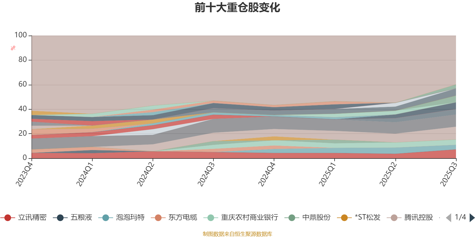 截至2025年三季度末,基金十大重仓股分别是腾讯控股、宁德时代、立讯精密、阿里巴巴-W、思特威、药明康德、重庆农村商业银行、东睦股份、泡泡玛特、中国宏桥。