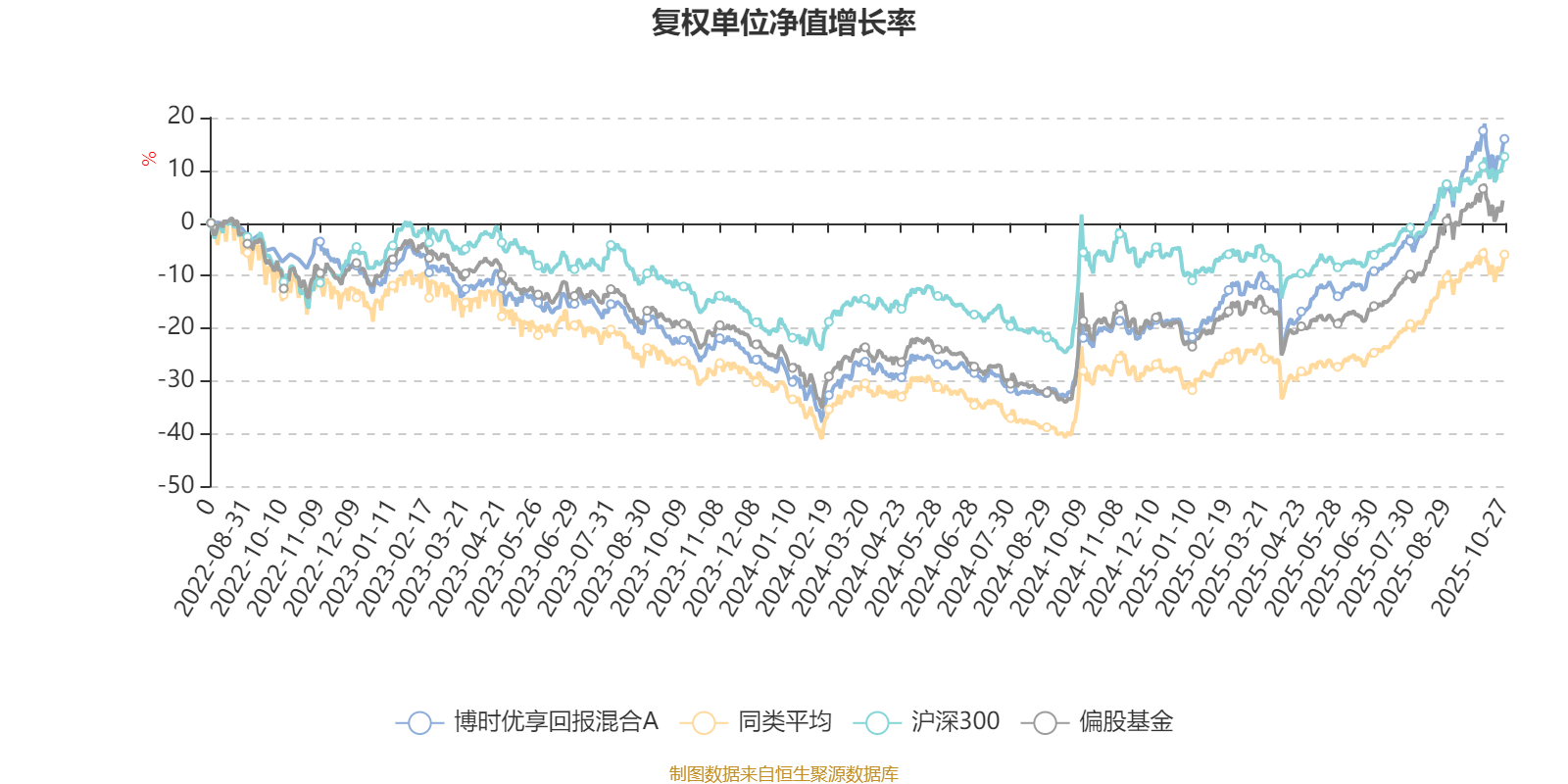 截至10月27日,博时优享回报混合A近三个月复权单位净值增长率为20.32%,位于同类可比基金210/621;近半年复权单位净值增长率为39.19%,位于同类可比基金167/619;近一年复权单位净值增长率为44.80%,位于同类可比基金142/611;近三年复权单位净值增长率为24.49%,位于同类可比基金198/518。