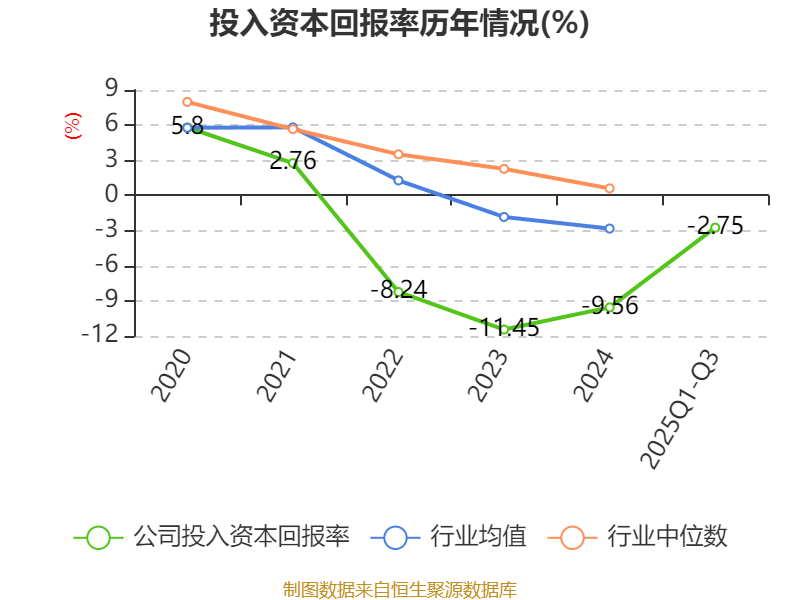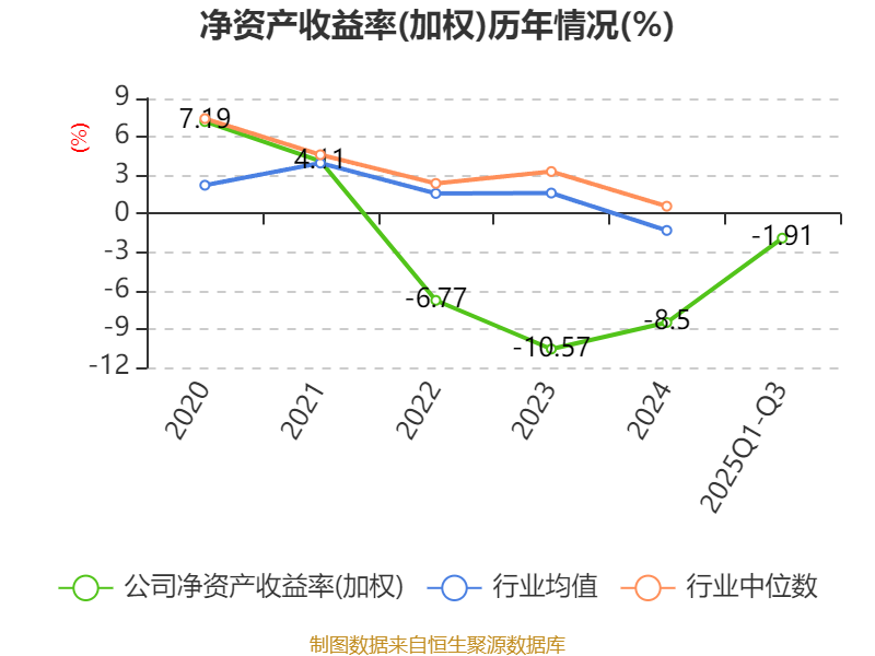 盈利能力方面, 2025年前三季度公司加权平均净资产收益率为-1.91%,同比上升3.83个百分点。公司2025年前三季度投入资本回报率为-2.75%,较上年同期上升3.65个百分点。