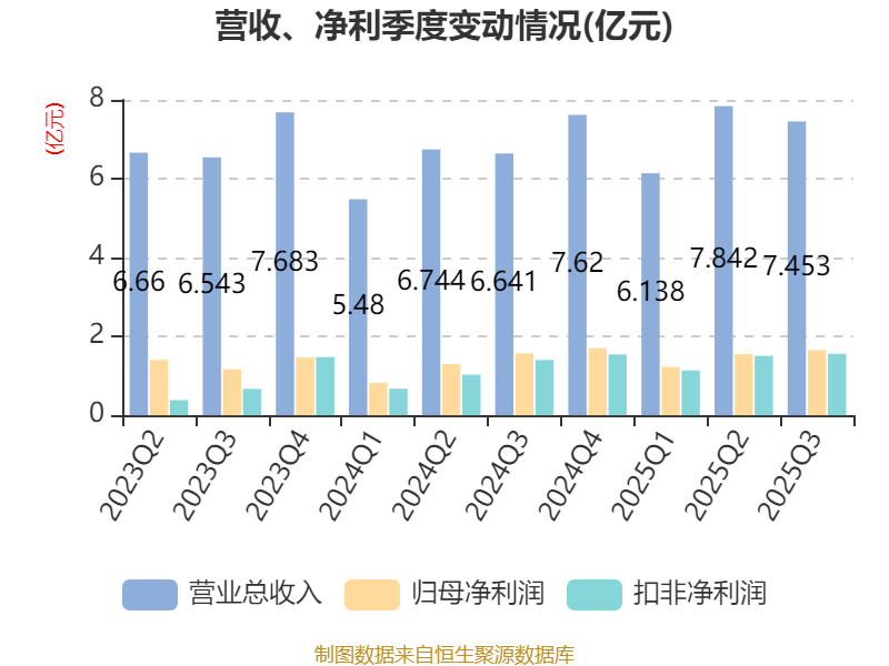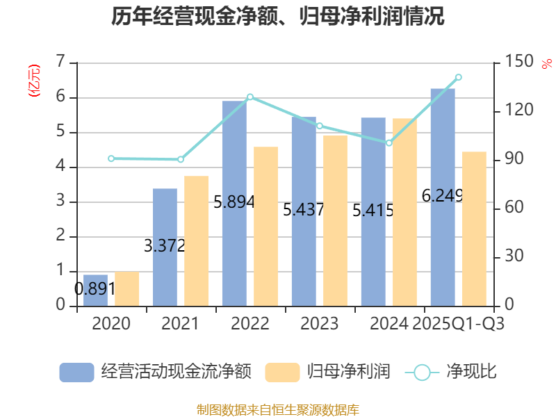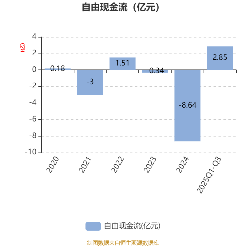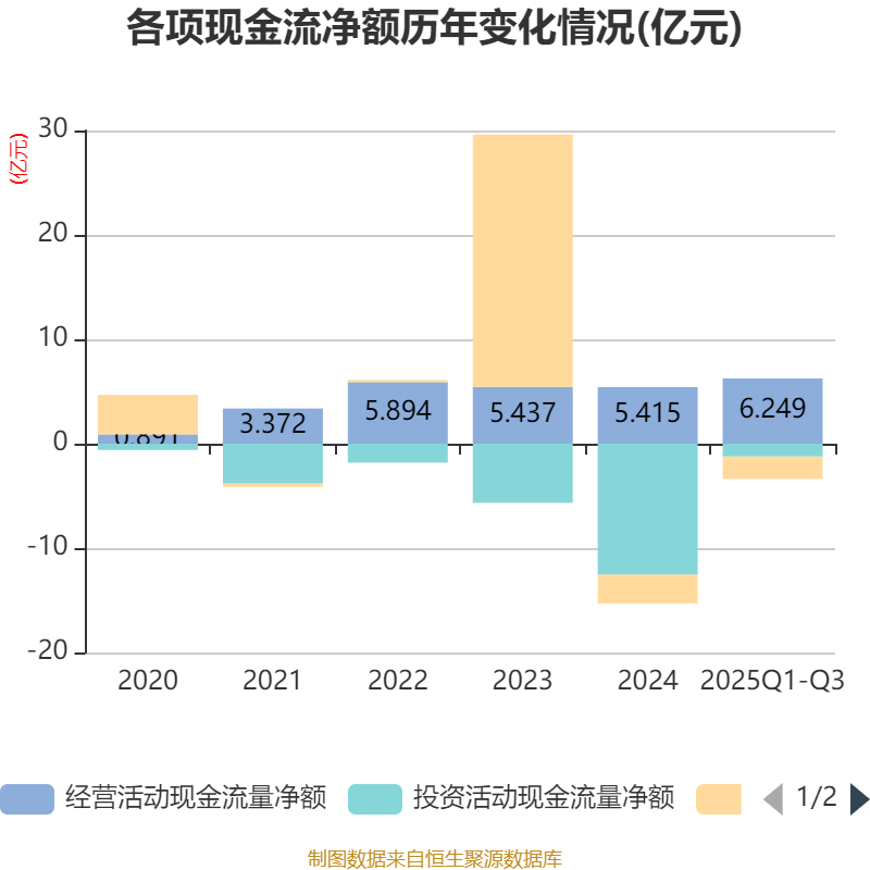 2025年前三季度,公司经营活动现金流净额为6.25亿元,同比下降14.53%;筹资活动现金流净额-2.15亿元,同比增加5667.5万元;投资活动现金流净额-1.23亿元,上年同期为-13.45亿元。