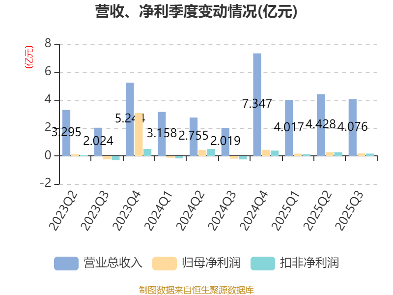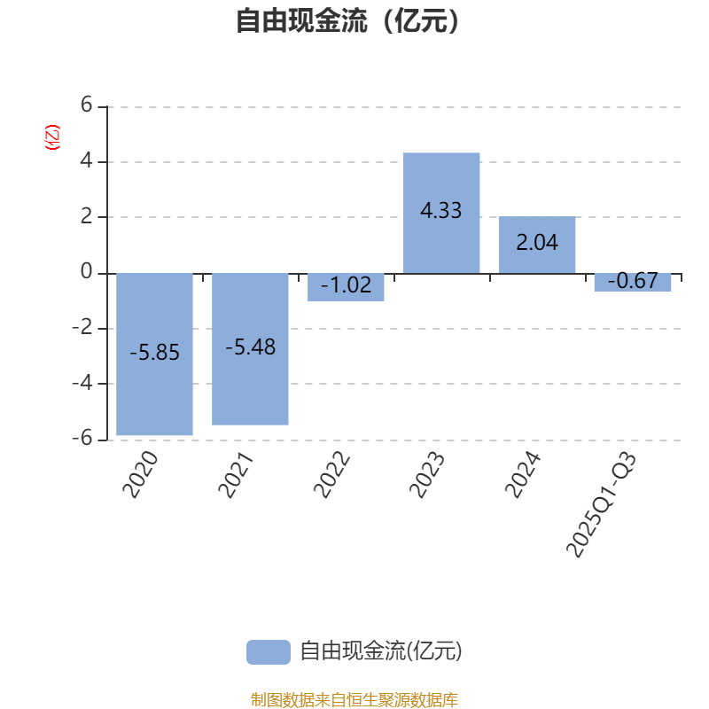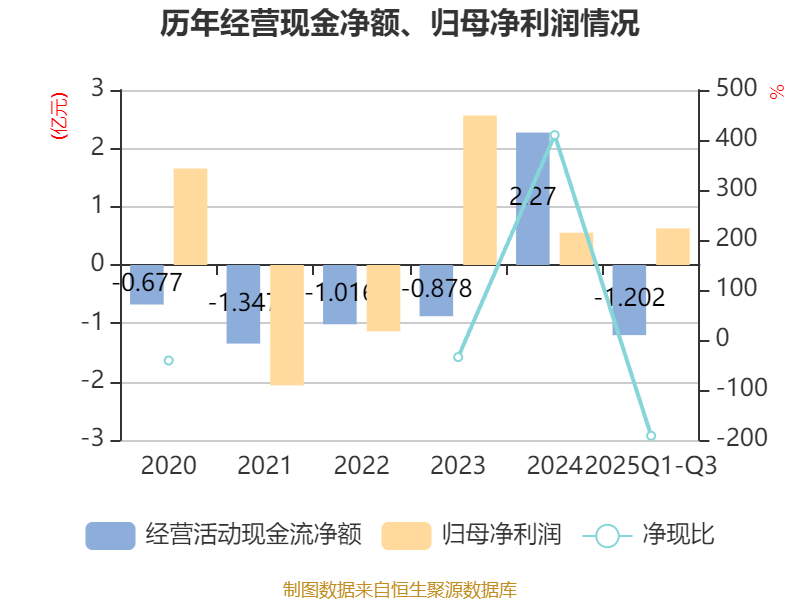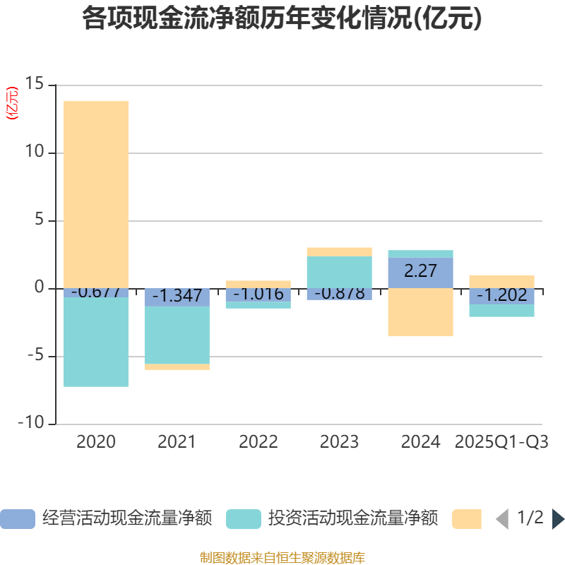 2025年前三季度,公司经营活动现金流净额为-1.2亿元,同比减少7618.37万元;筹资活动现金流净额9463.7万元,同比增加3.21亿元;投资活动现金流净额-9135.76万元,上年同期为6151.45万元。