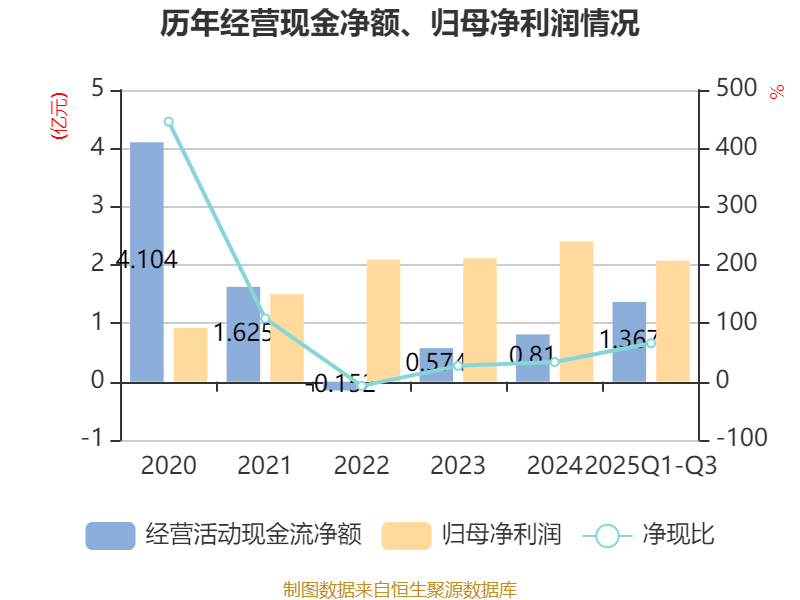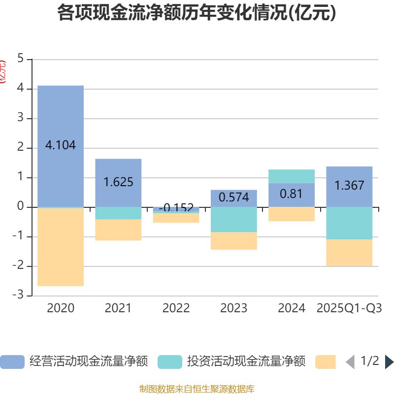 2025年前三季度,公司经营活动现金流净额为1.37亿元,同比增长255.12%;筹资活动现金流净额-8925.32万元,同比减少6253.56万元;投资活动现金流净额-1.11亿元,上年同期为-588.85万元。