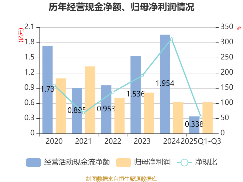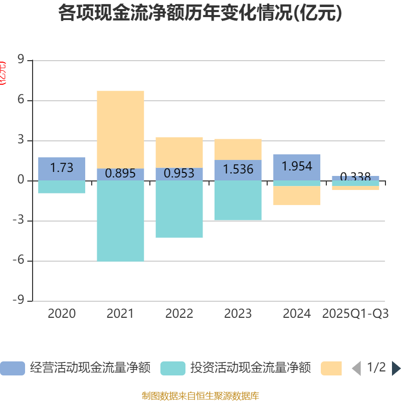 2025年前三季度,公司经营活动现金流净额为3375.68万元,同比下降46.59%;筹资活动现金流净额-2964.99万元,同比减少4448.8万元;投资活动现金流净额-4151.27万元,上年同期为-3808.38万元。