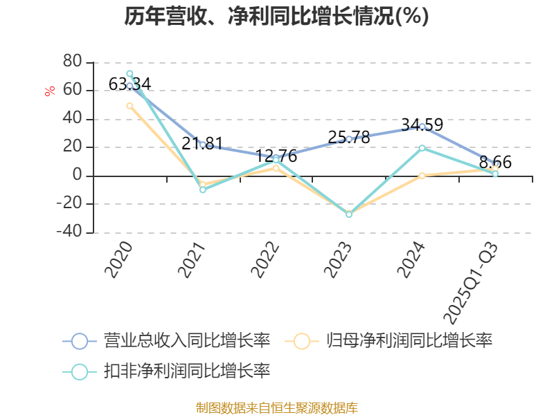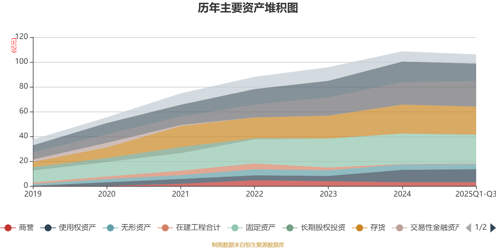 资产重大变化方面,截至2025年三季度末,公司应收票据及应收账款较上年末增加13%,占公司总资产比重上升2.61个百分点;货币资金较上年末减少14.21%,占公司总资产比重下降1.86个百分点;其他流动资产较上年末减少45.2%,占公司总资产比重下降0.95个百分点;固定资产较上年末减少5.17%,占公司总资产比重下降0.66个百分点。