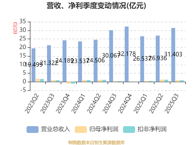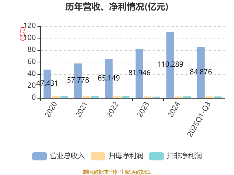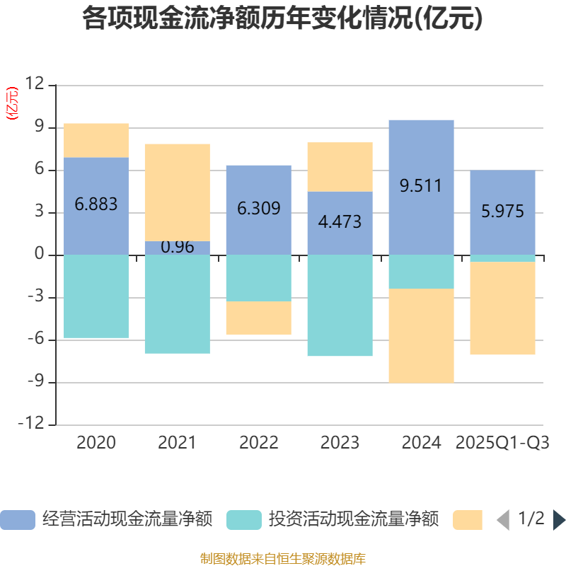 2025年前三季度,公司经营活动现金流净额为5.97亿元,同比下降20.44%;筹资活动现金流净额-6.54亿元,同比增加648.59万元;投资活动现金流净额-5167.69万元,上年同期为-1.68亿元。