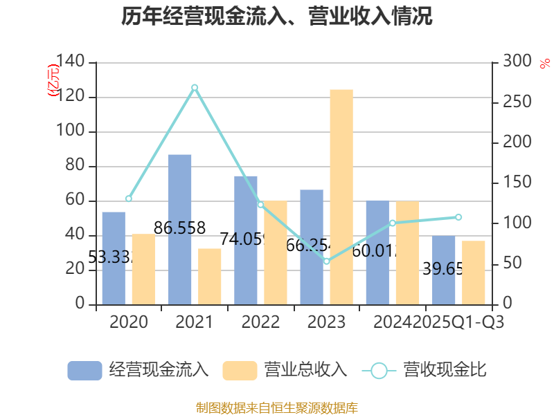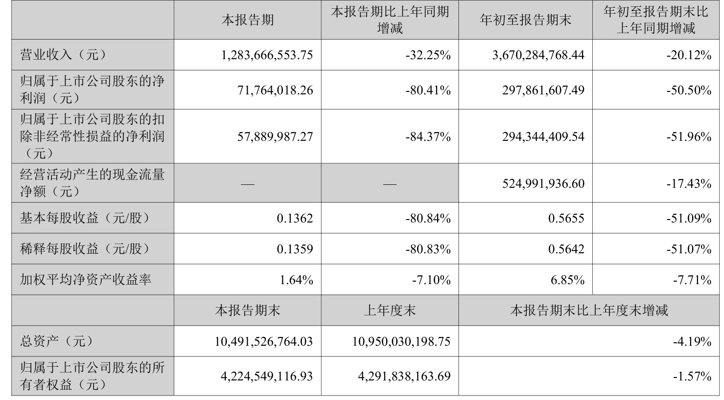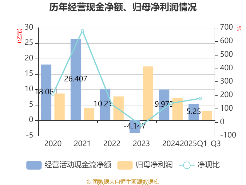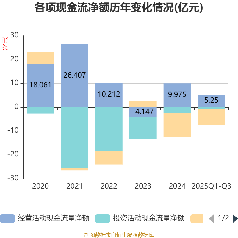 2025年前三季度,公司经营活动现金流净额为5.25亿元,同比下降17.43%;筹资活动现金流净额-6.66亿元,同比增加1375.79万元;投资活动现金流净额-8800.6万元,上年同期为-1.5亿元。