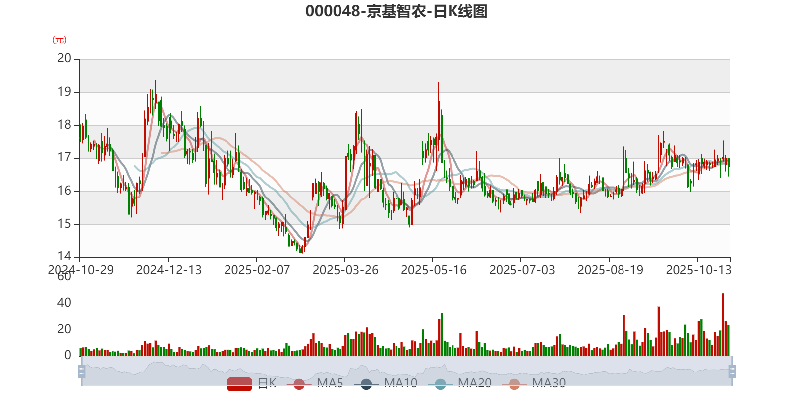 中证智能财讯京基智农(000048)10月29日披露2025年第三季度报告。前三季度公司实现营业总收入36.7亿元,同比下降20.12%;归母净利润2.98亿元,同比下降50.50%;扣非净利润2.94亿元,同比下降51.96%;经营活动产生的现金流量净额为5.25亿元,同比下降17.43%;报告期内,京基智农基本每股收益为0.5655元,加权平均净资产收益率为6.85%。