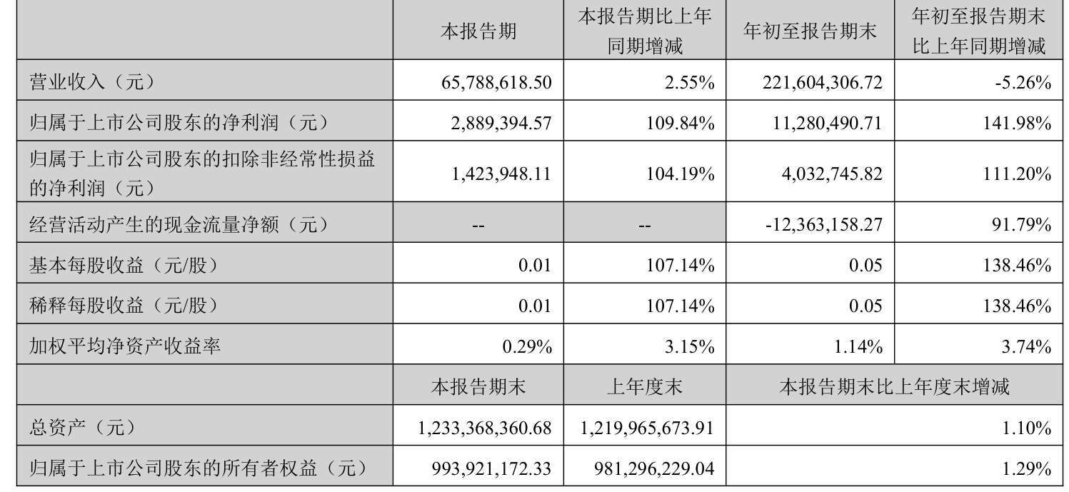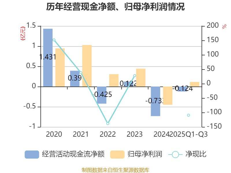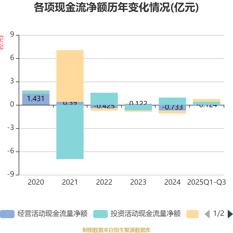 2025年前三季度,公司经营活动现金流净额为-1236.32万元,同比增加1.38亿元;筹资活动现金流净额3524.92万元,同比增加6654.3万元;投资活动现金流净额4059.67万元,上年同期为1.25亿元。
