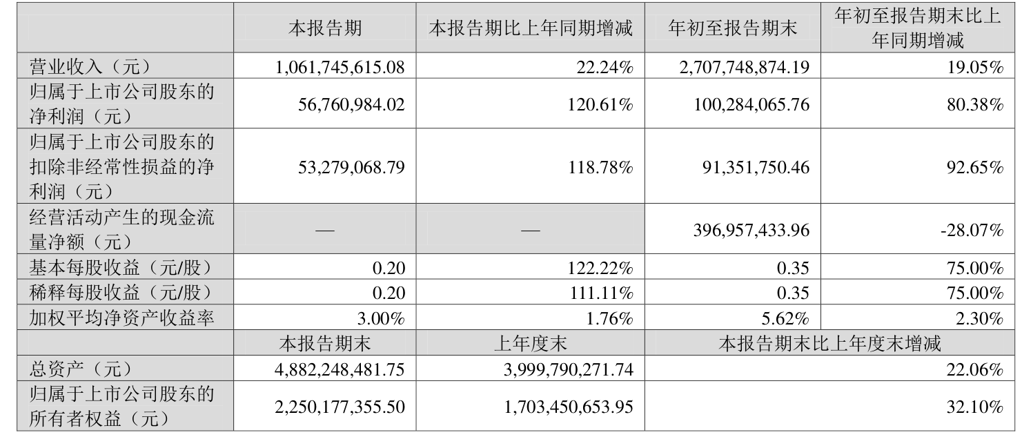 中证智能财讯和胜股份(002824)10月29日披露2025年第三季度报告。前三季度公司实现营业总收入27.08亿元,同比增长19.05%;归母净利润1亿元,同比增长80.38%;扣非净利润9135.18万元,同比增长92.65%;经营活动产生的现金流量净额为3.97亿元,同比下降28.07%;报告期内,和胜股份基本每股收益为0.35元,加权平均净资产收益率为5.62%。