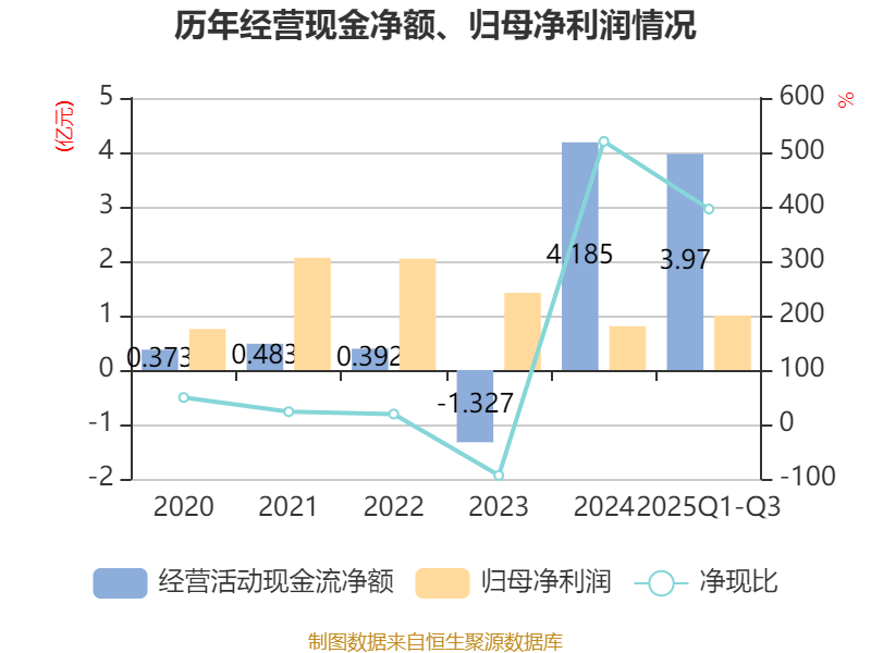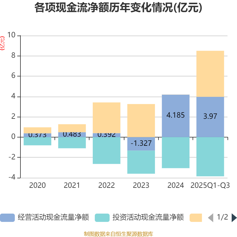 2025年前三季度,公司经营活动现金流净额为3.97亿元,同比下降28.07%;筹资活动现金流净额4.53亿元,同比增加5.99亿元;投资活动现金流净额-3.86亿元,上年同期为-3亿元。